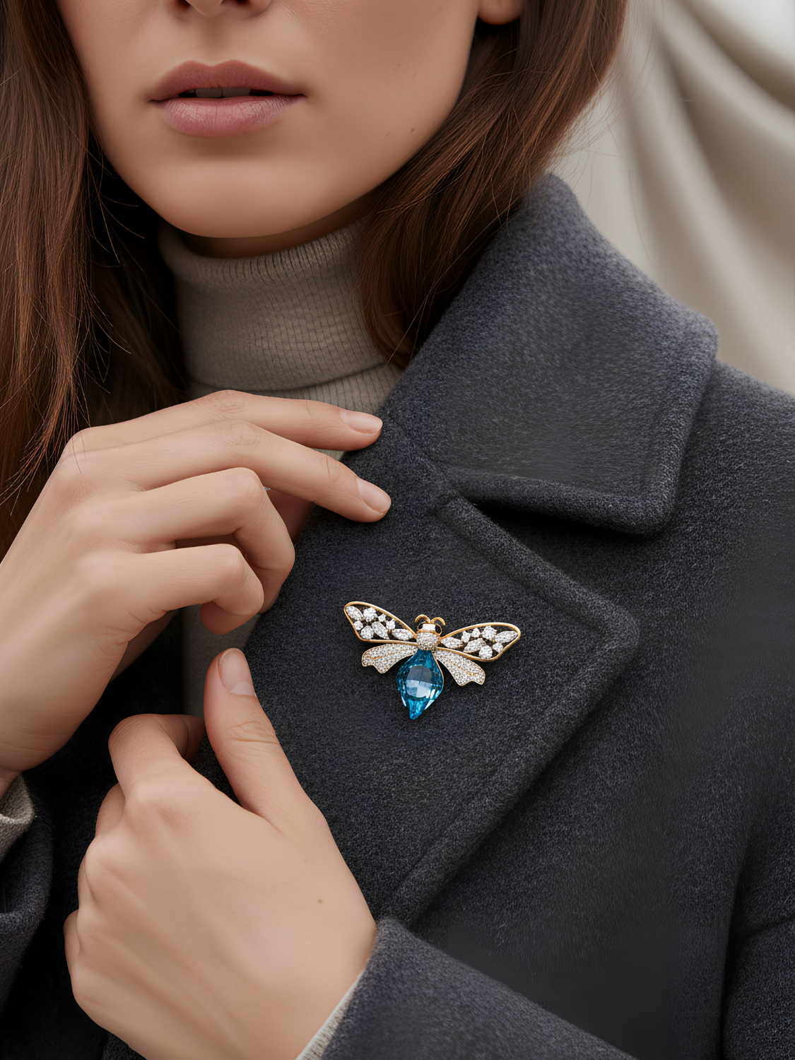 Γυναικεία Καρφίτσα Μέλισσα με Κρύσταλλο Aquamarine και Ζιργκόν