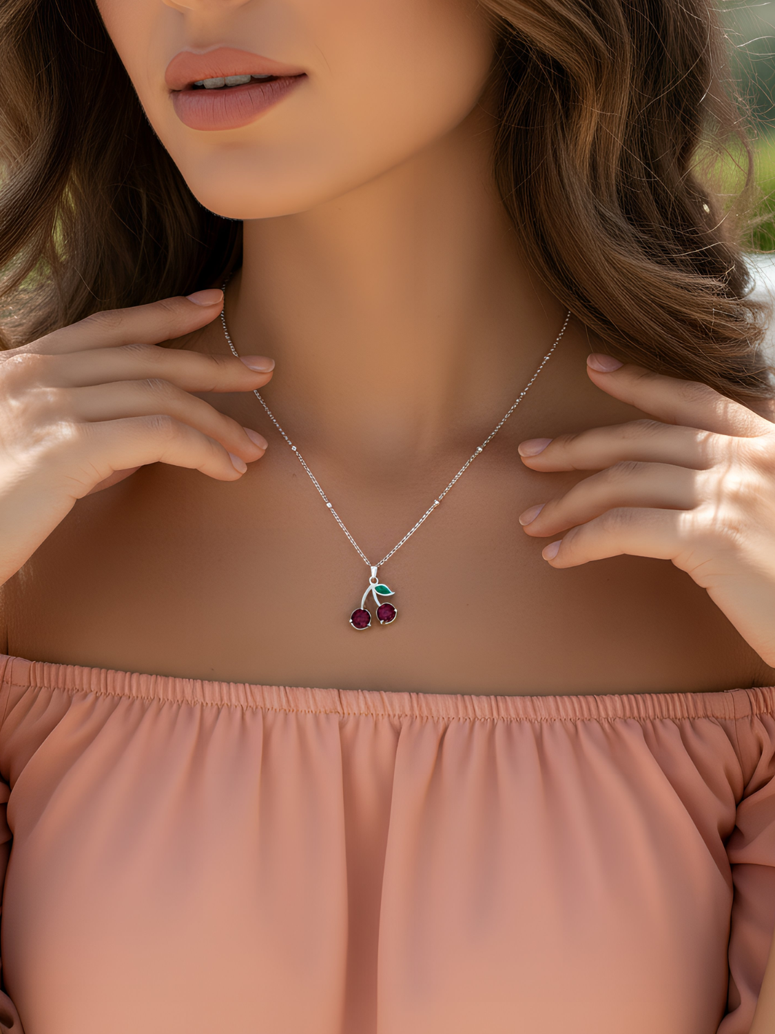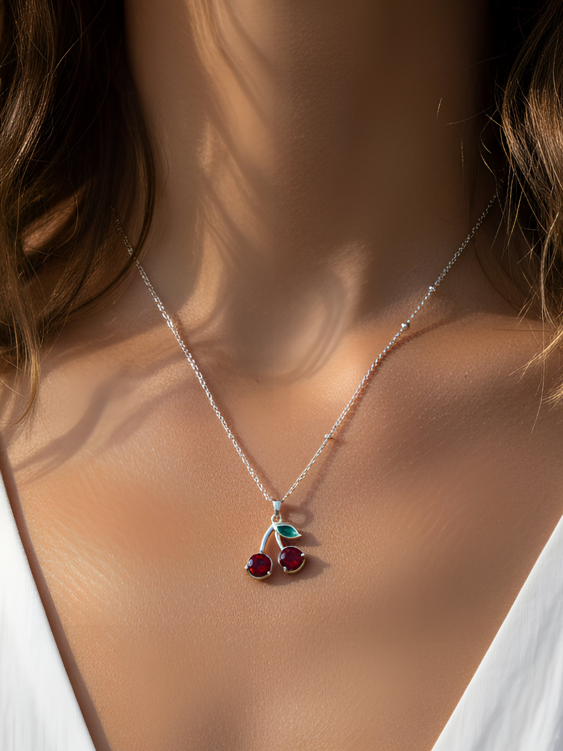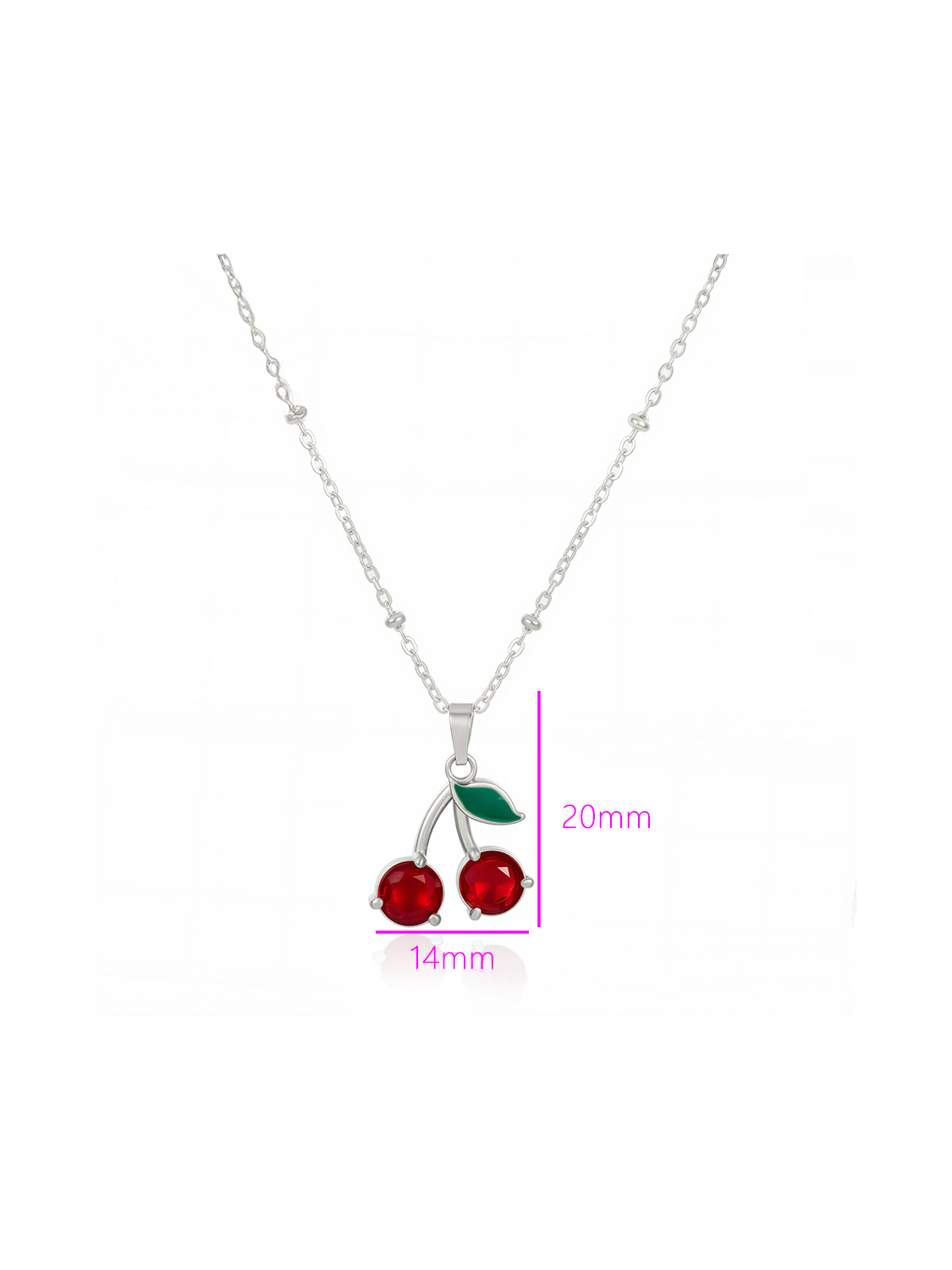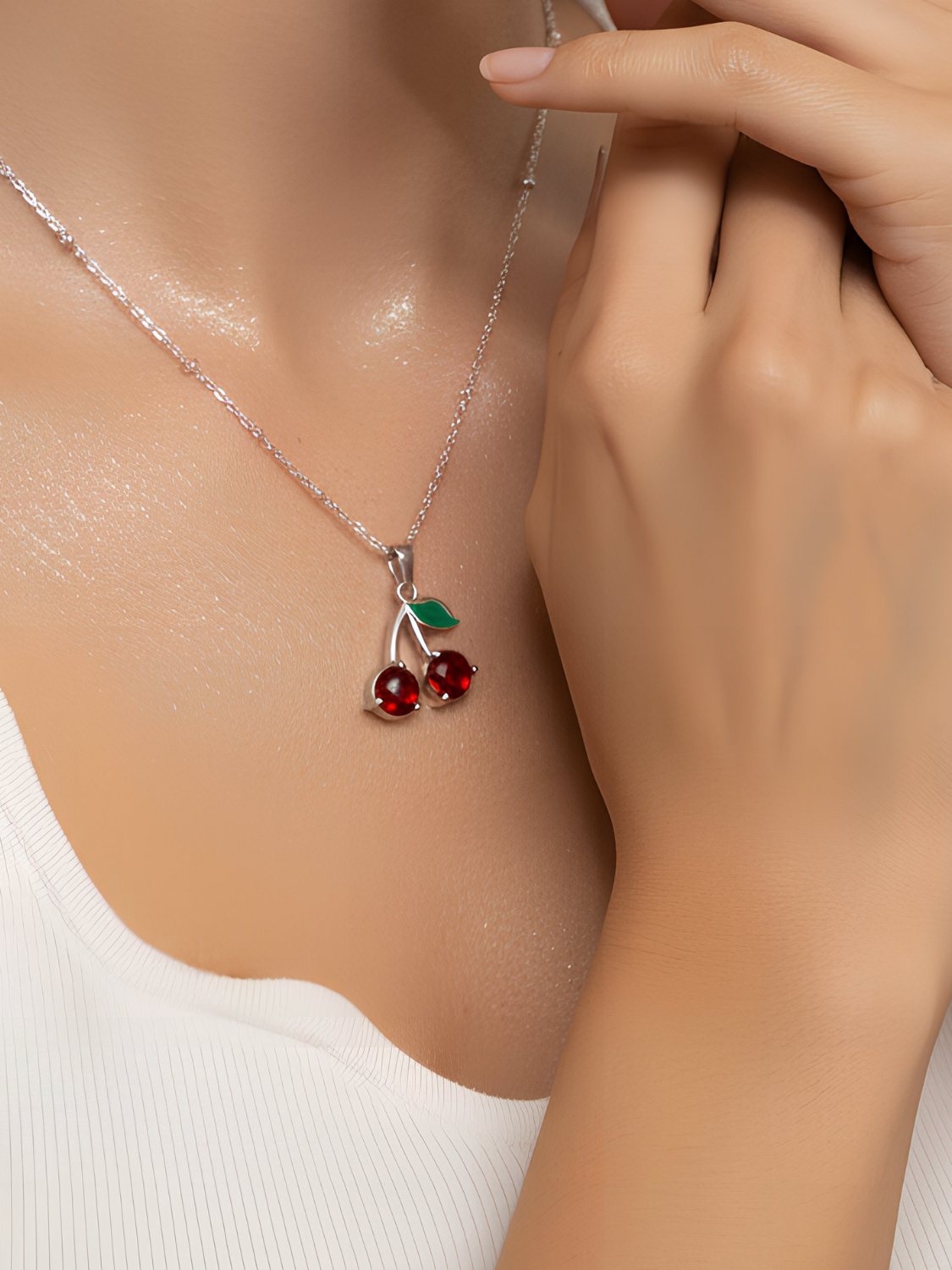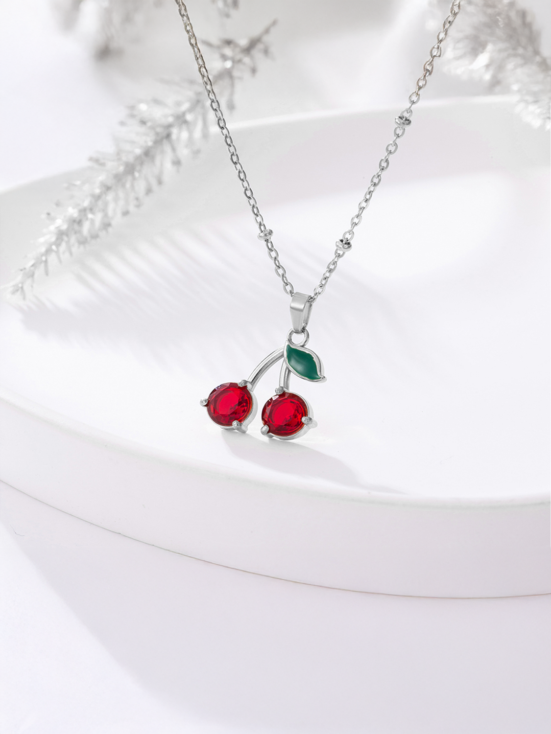 Γυναικείο ασημένιο κολιέ κεράσια με λεπτομέρεια πράσινου φύλλου