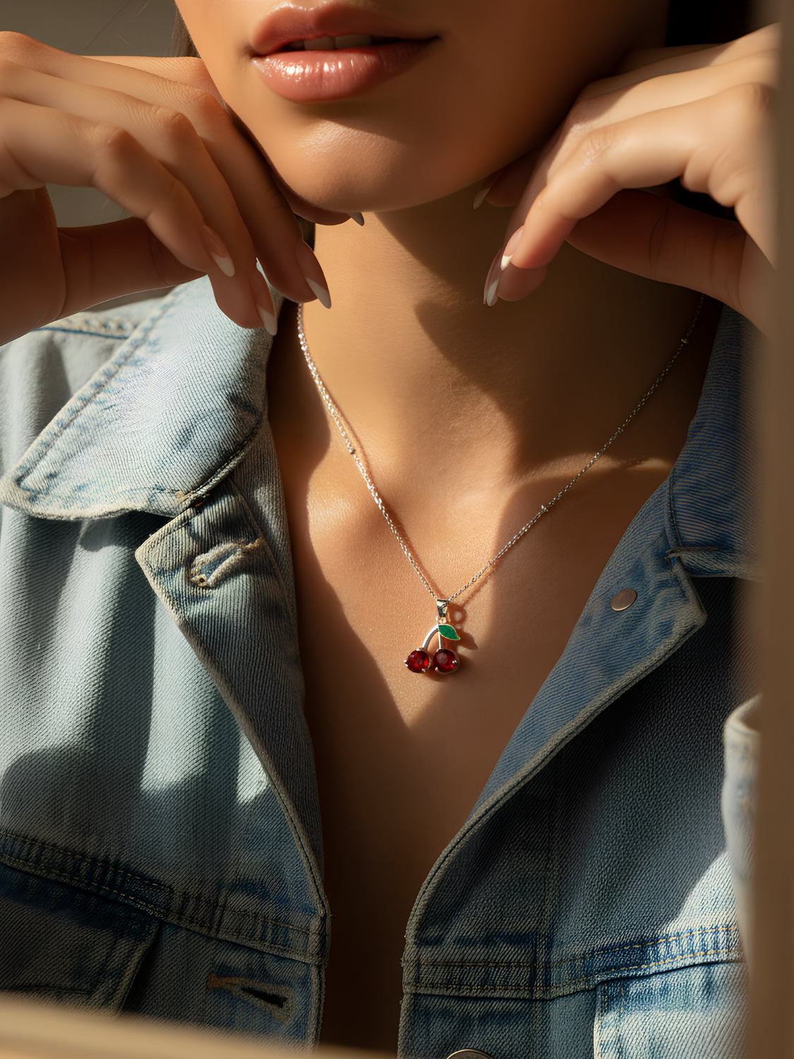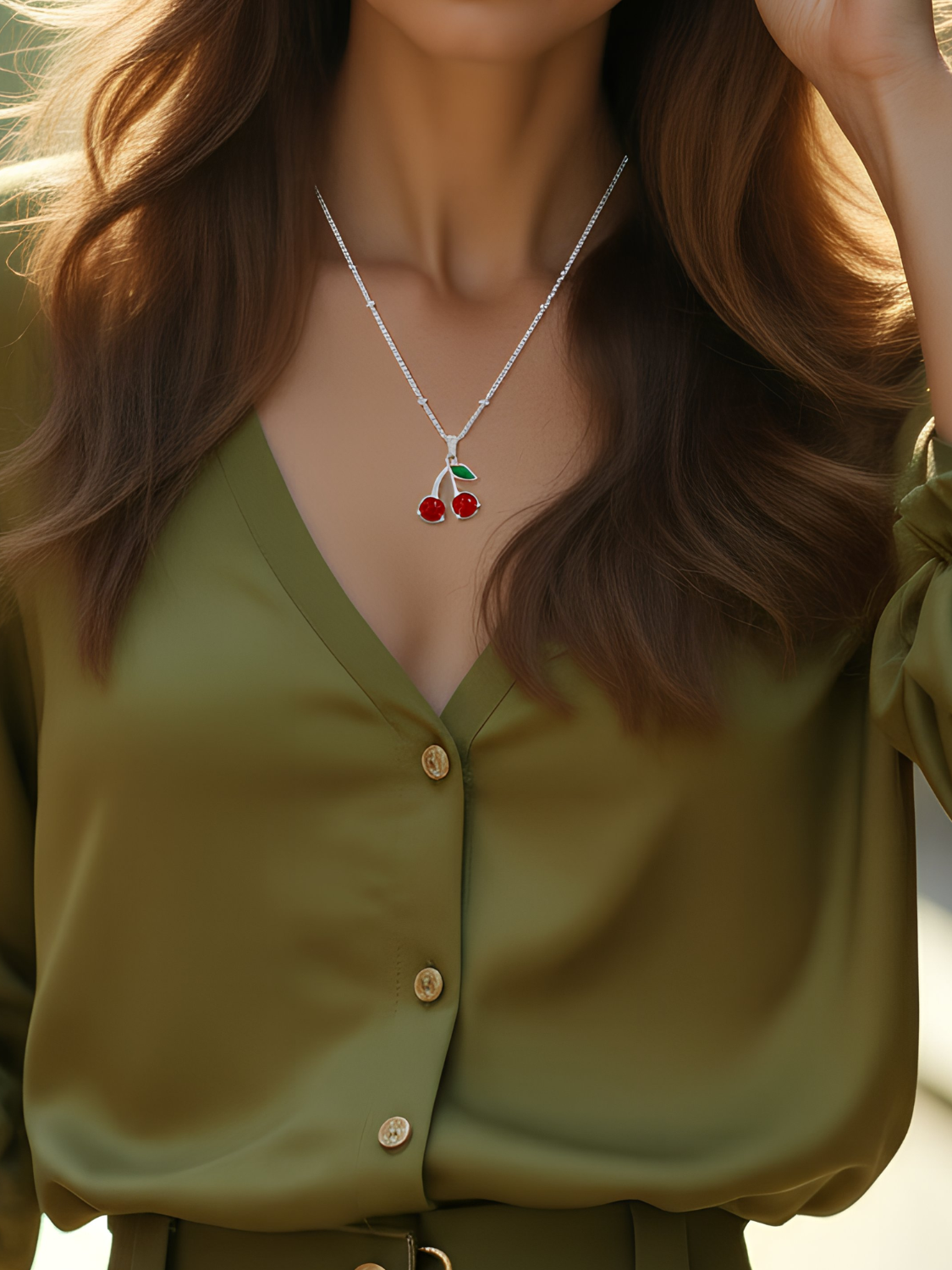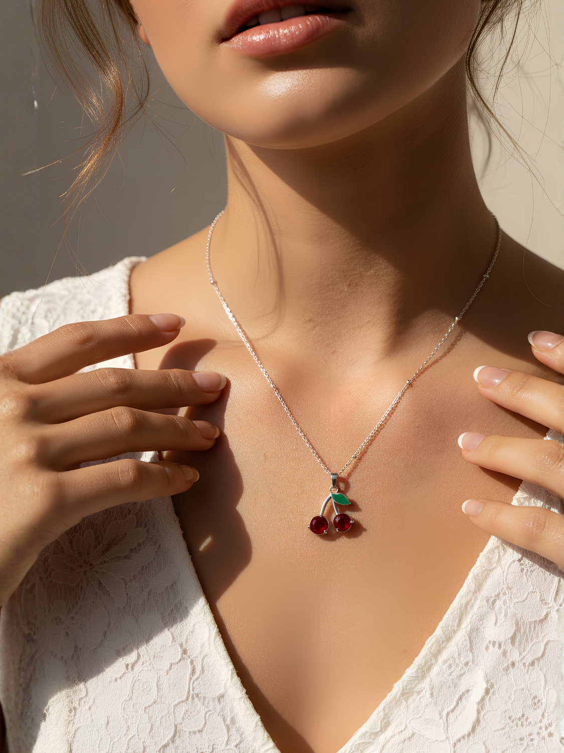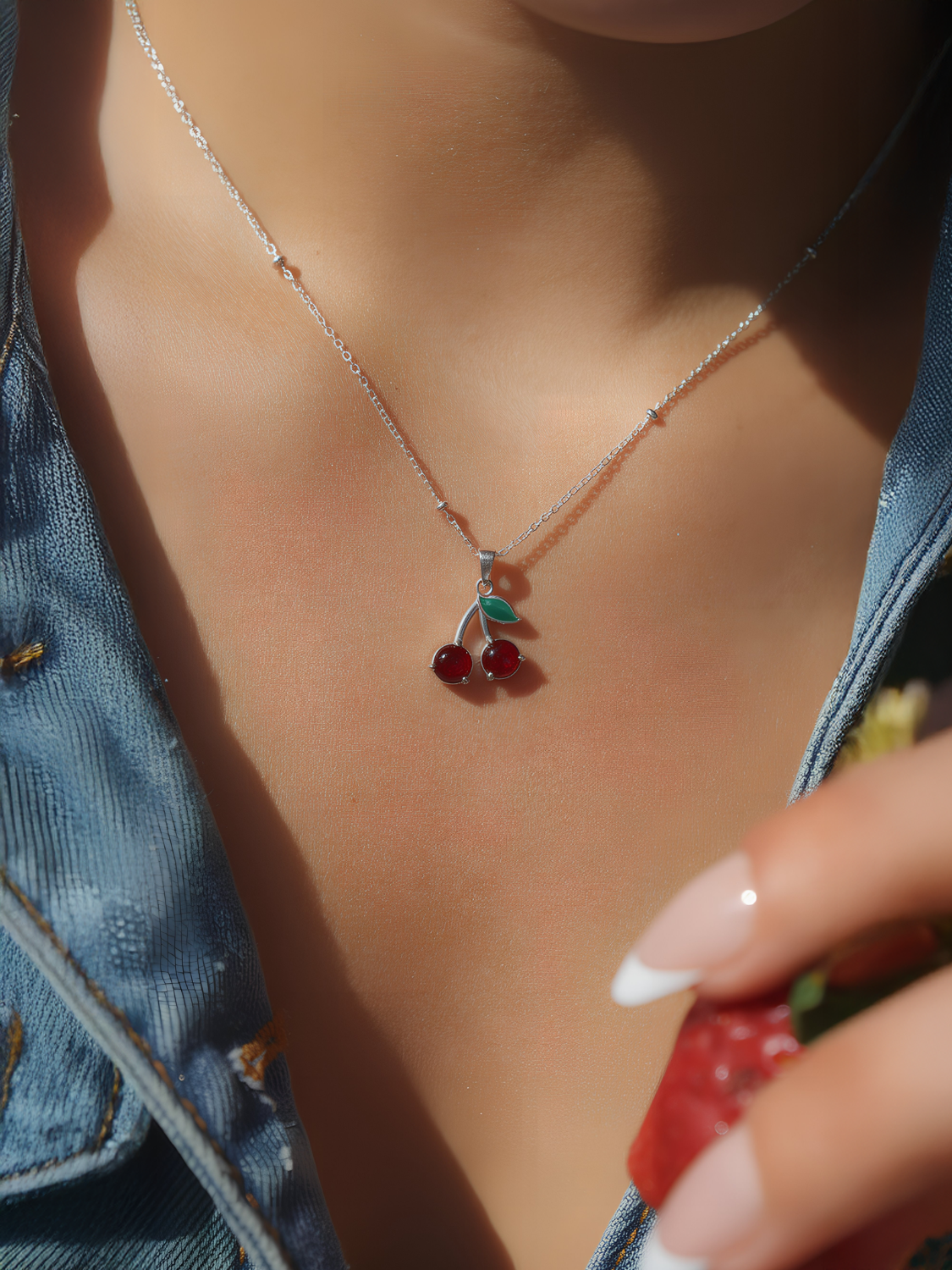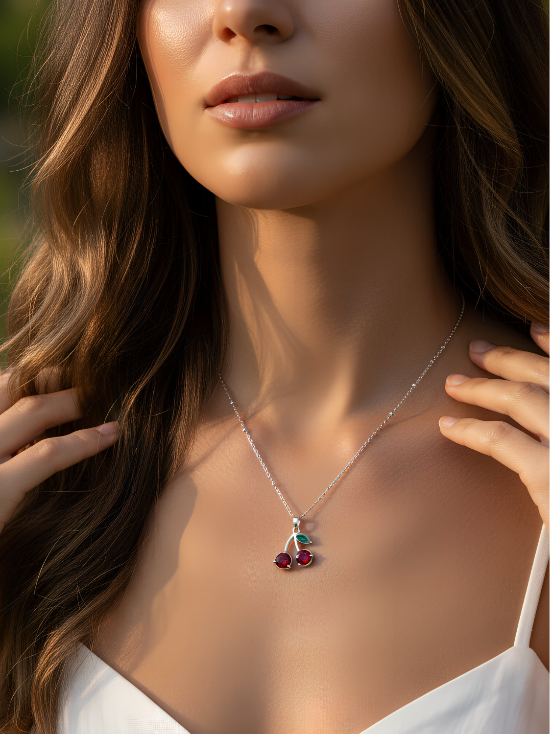 Γυναικείο ασημένιο κολιέ κεράσια με λεπτομέρεια πράσινου φύλλου