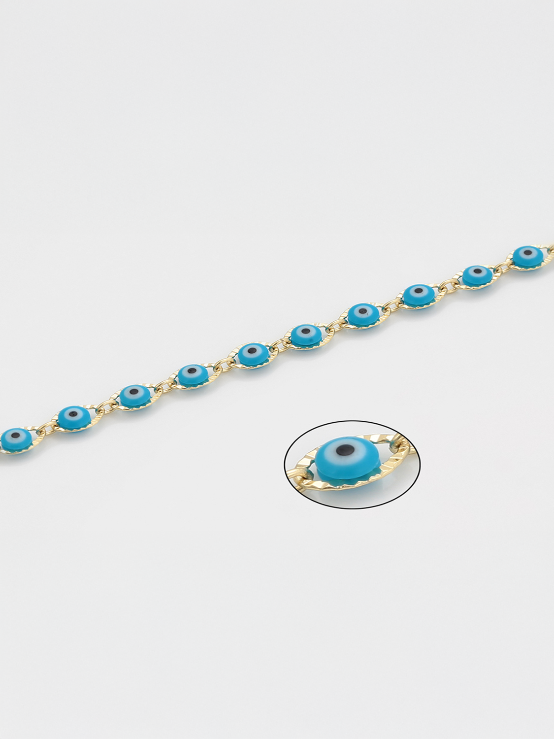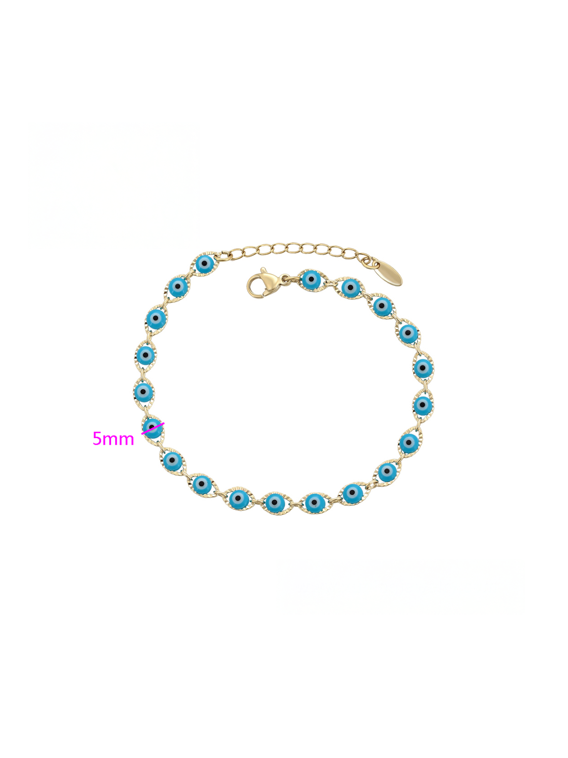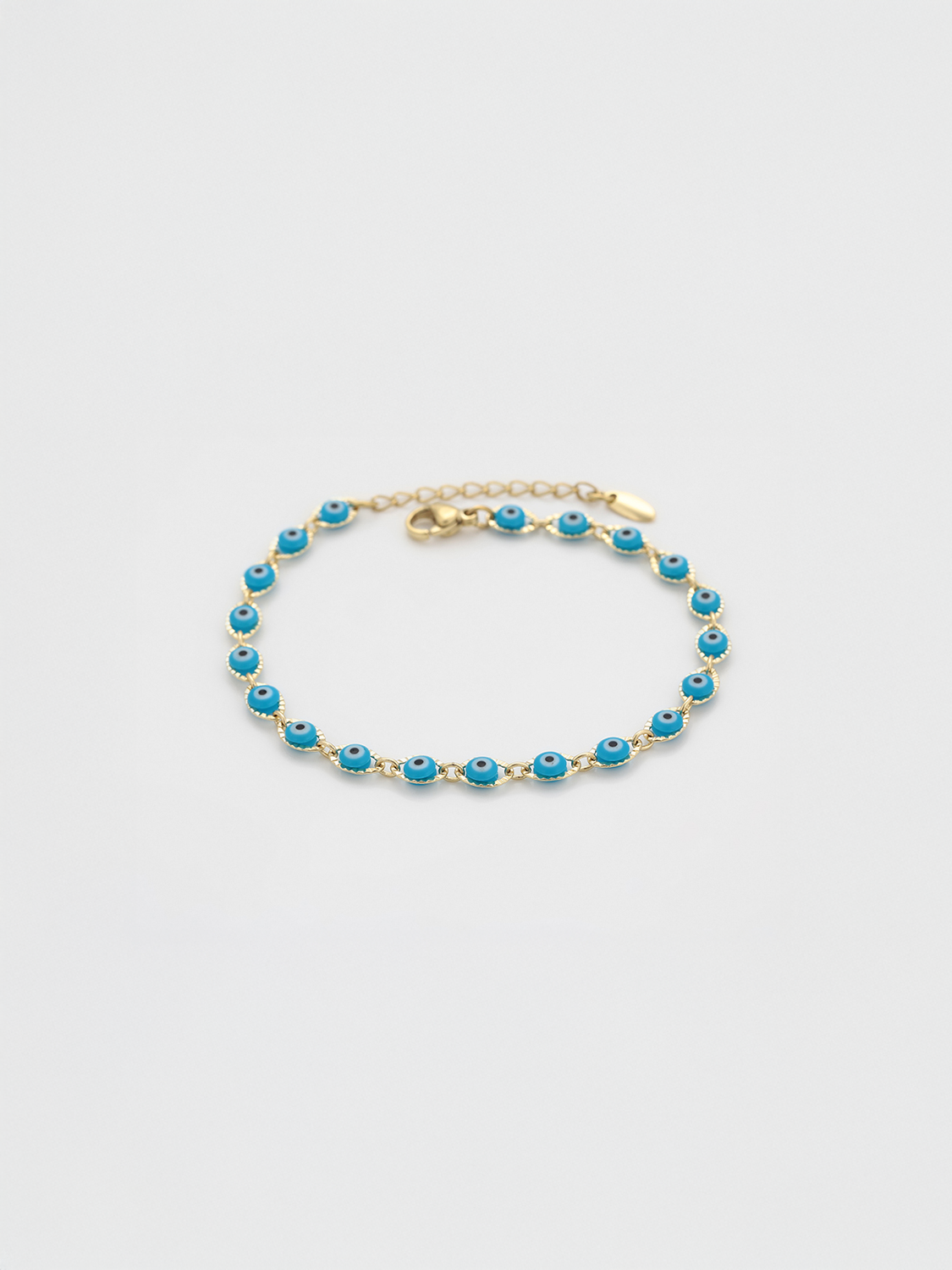 Το Aegean Charm είναι ένα κομψό γυναικείο βραχιόλι, εμπνευσμένο από τη μαγεία της Μεσογείου. Κατασκευασμένο από οικολογικό χαλκό σε απόχρωση 14K χρυσό χρώμα, διαθέτει διακριτικά μπλε ματάκια που λειτουργούν ως φυλαχτό προστασίας. Το βραχιόλι έχει μήκος 18 cm και επιπλέον επέκταση 3 cm για τέλεια εφαρμογή. Ιδανικό για καθημερινή χρήση ή ως δώρος τύχης, προσφέρει μία πινελιά φωτεινότητας και θετικής καλής ενέργειας στο στιλ σας.