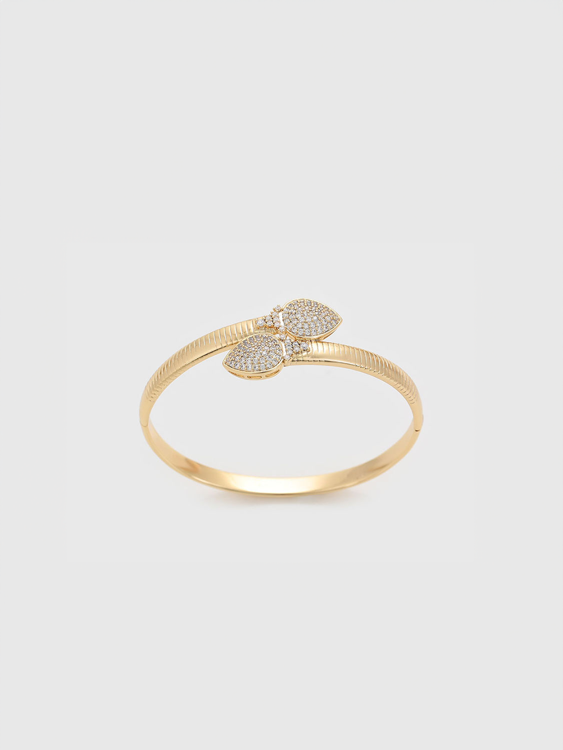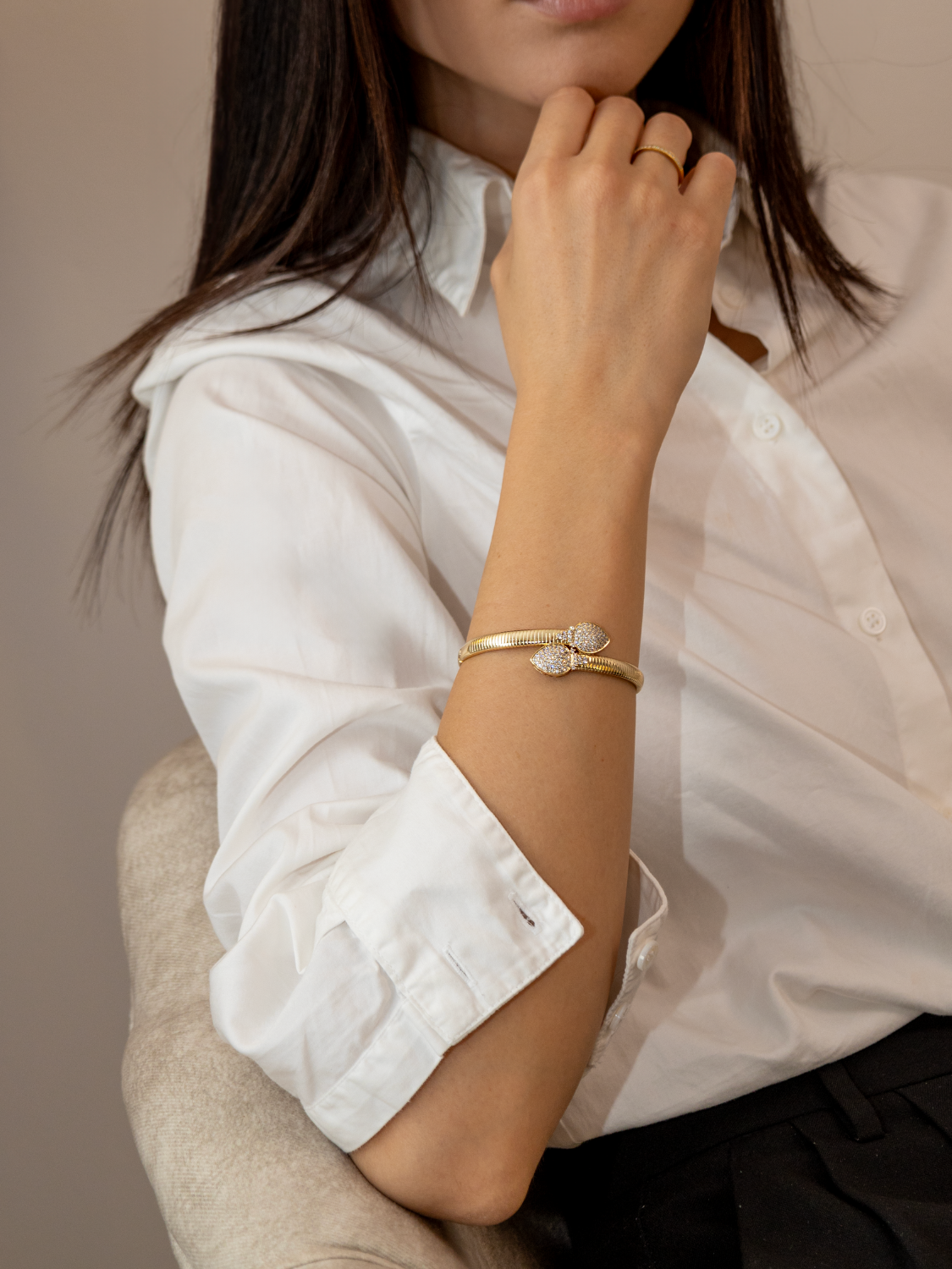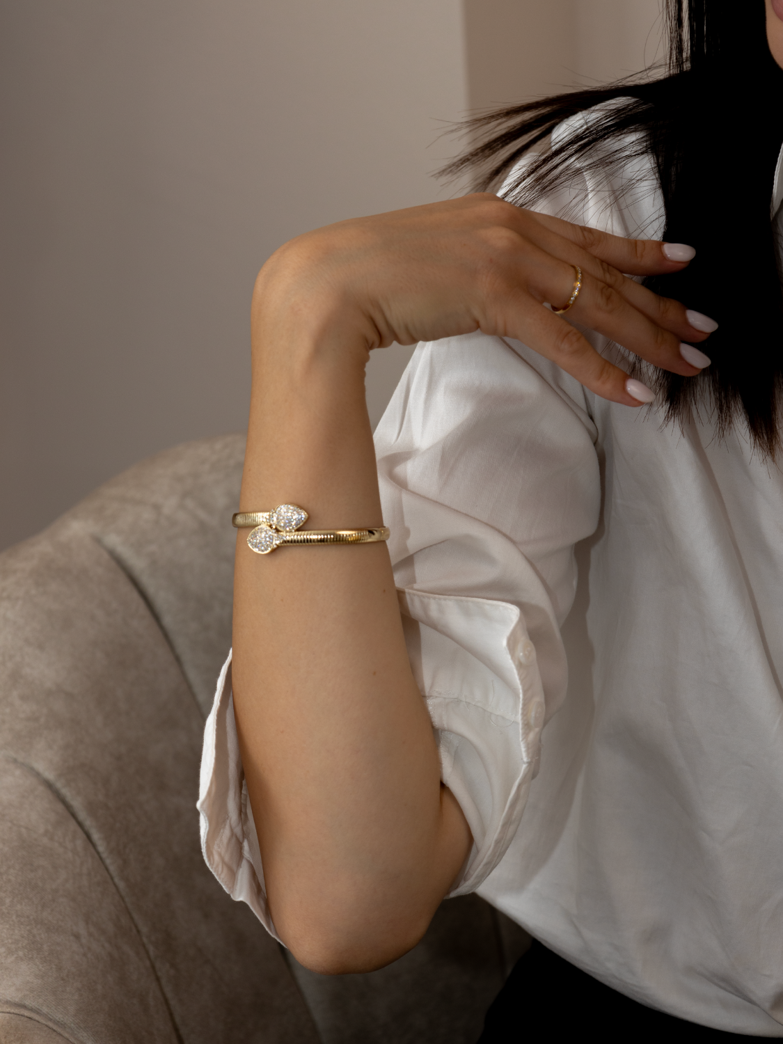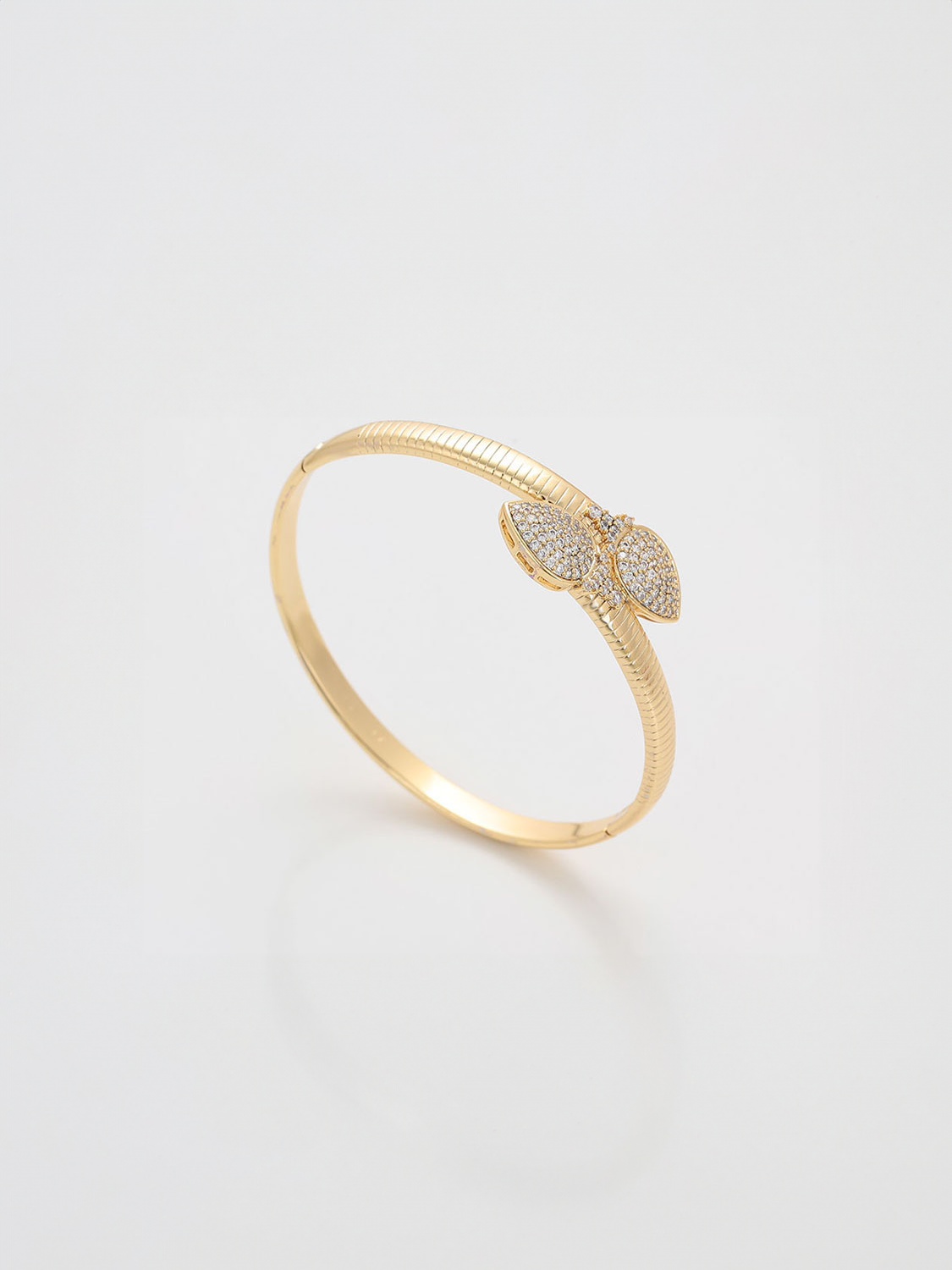 Αναδείξτε την κομψότητα και την εκλεπτυσμένη σας λάμψη με το άκαμπτο βραχιόλι "Amara" . Κατασκευασμένο από οικολογικό χαλκό και επιχρυσωμένο με 14Κ χρυσό, αυτό το βραχιόλι διακοσμείται με συνθετικές πέτρες ζιργκόν (CZ), προσφέροντας διακριτική λάμψη και πολυτέλεια για κάθε εμφάνιση. Το σχήμα του βραχιολιού και η λάμψη των πετρών το καθιστά ιδανικό για κάθε περίσταση, αναδεικνύοντας τη φυσική σας χάρη.