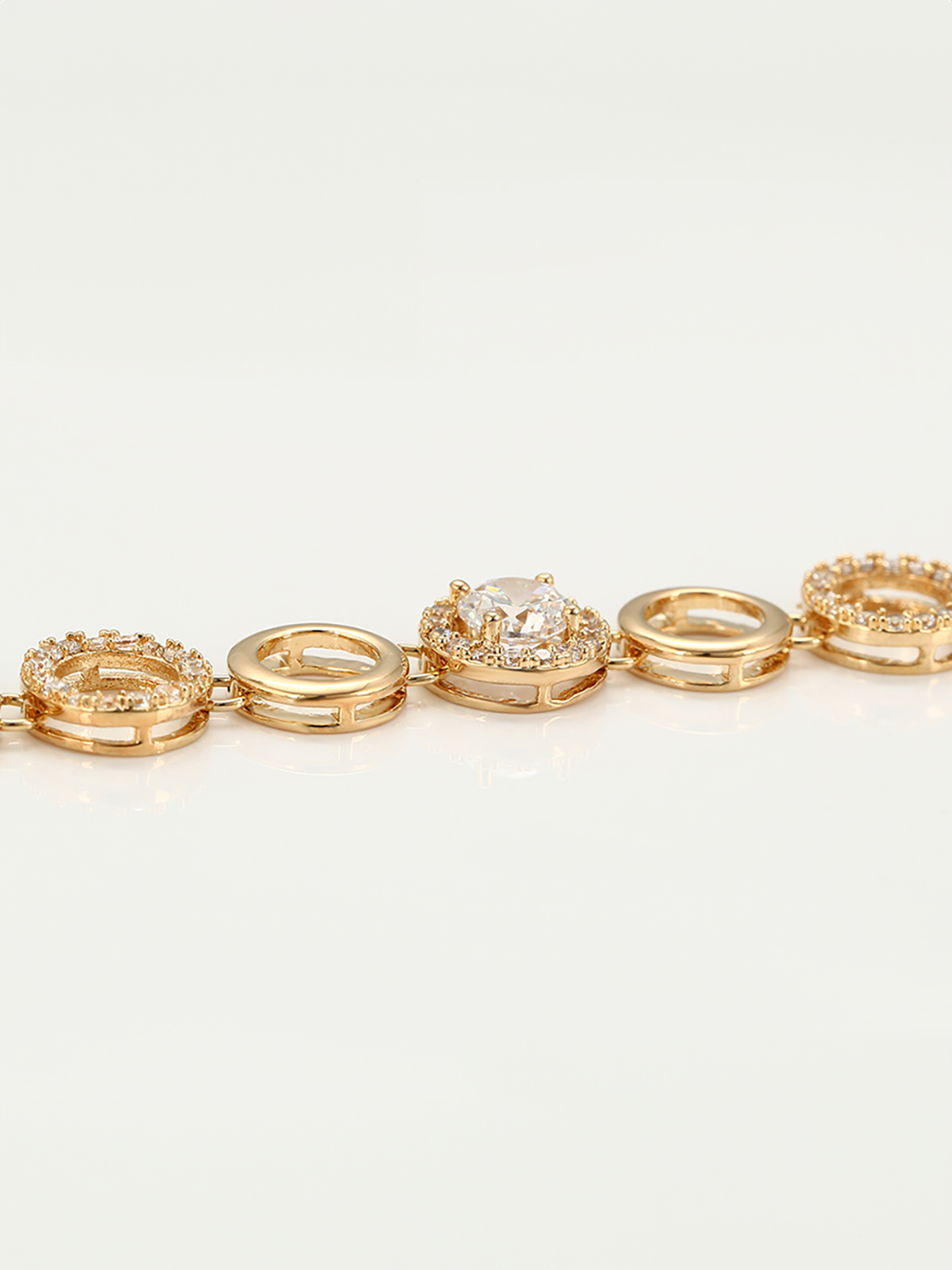 Αναδείξτε την κομψότητα και την εκλεπτυσμένη αισθητική σας με το Aurelia Circle Bracelet , ένα εκθαμβωτικό γυναικείο βραχιόλι κατασκευασμένο από οικολογικό χαλκό και επιχρυσωμένο με χρυσό 18Κ. Το βραχιόλι αυτό ξεχωρίζει για τα κυκλικά του μοτίβα, που περιλαμβάνει λαμπερούς κρυστάλλους διαμέτρου 6*6 mm, προσδίδοντας μια νότα πολυτέλειας σε κάθε σας εμφάνιση.