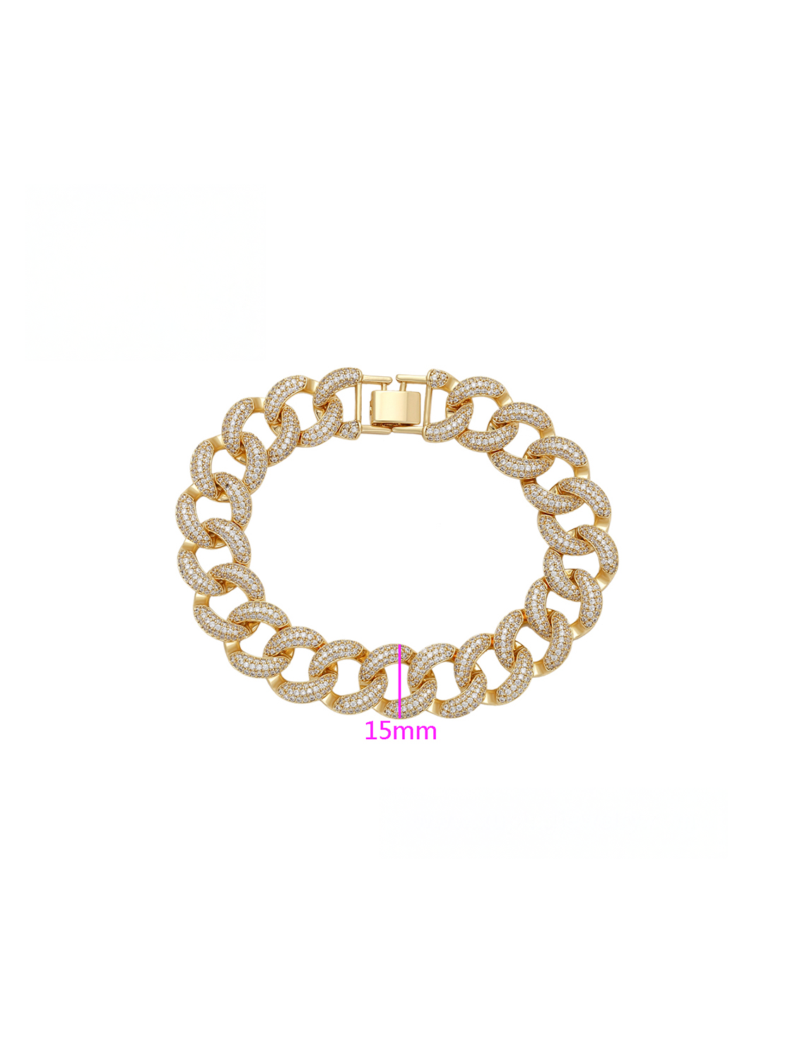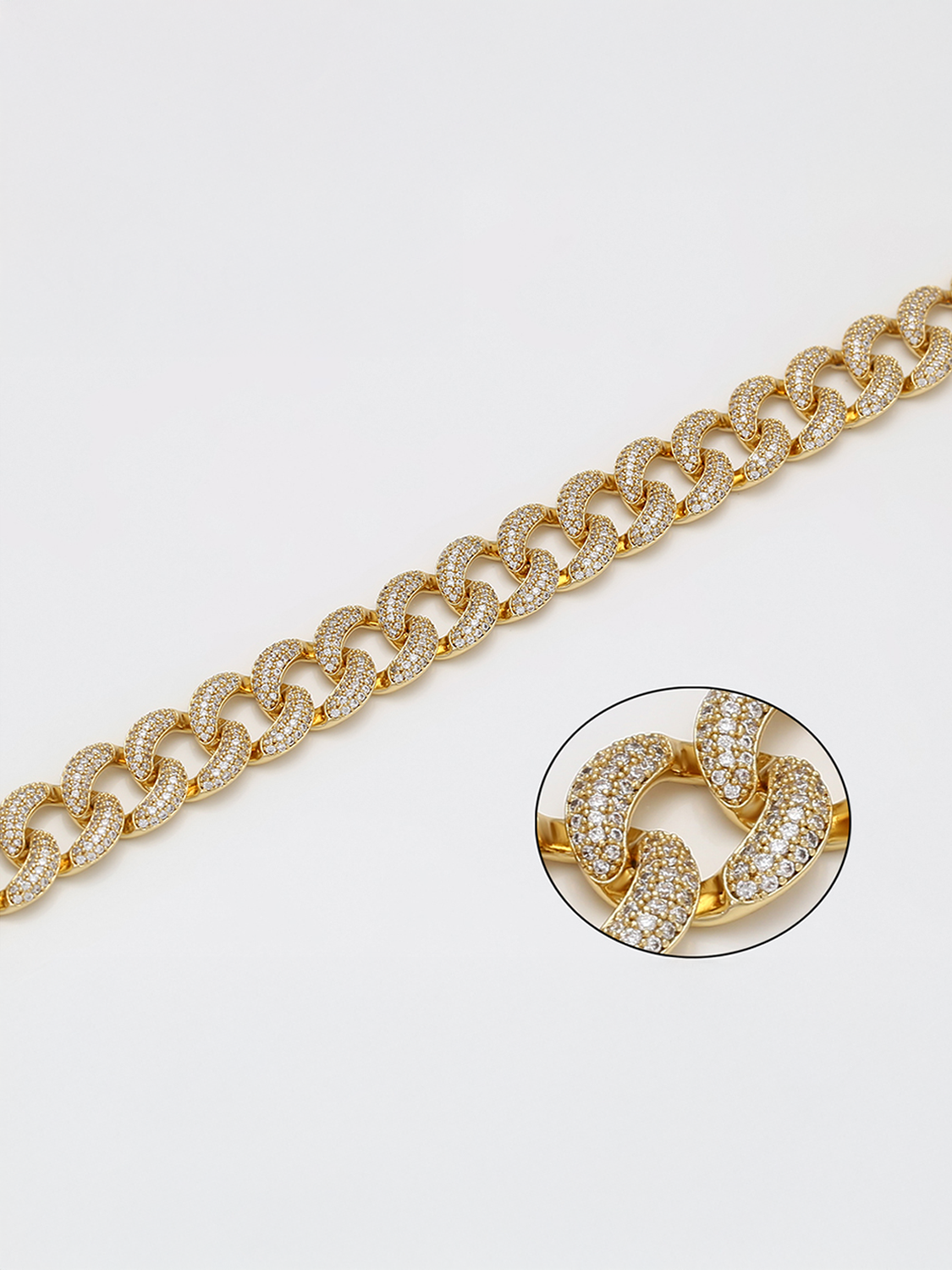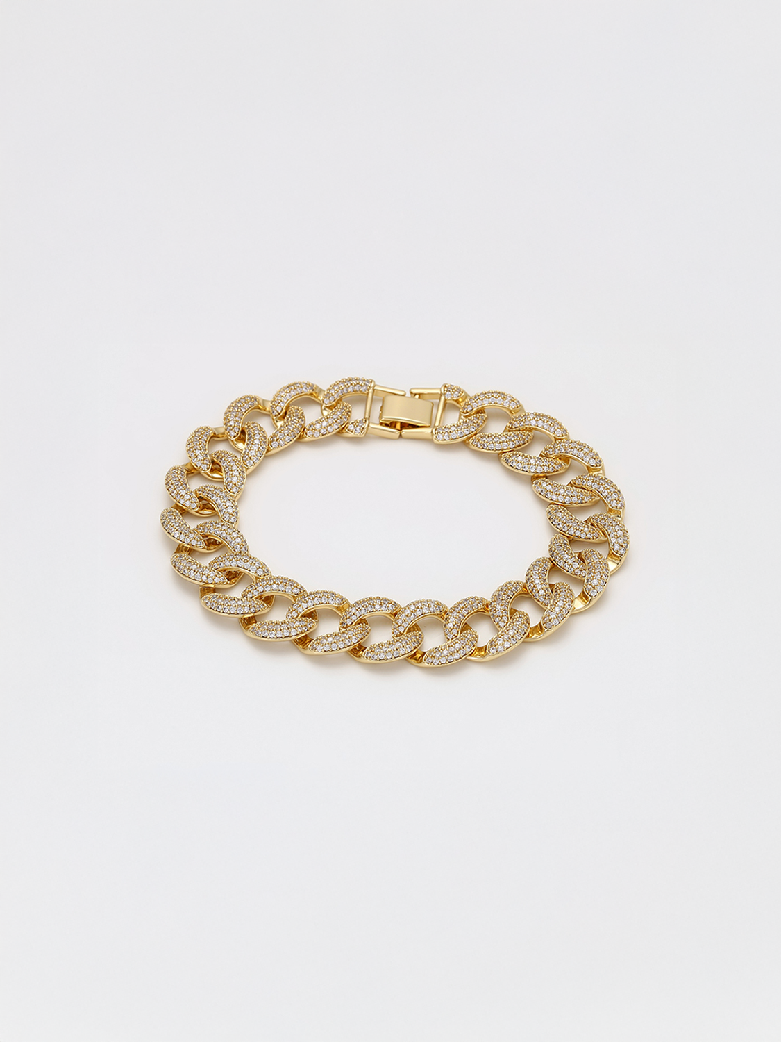 Το Aurum Glace είναι ένα εντυπωσιακό βραχιόλι τύπου αλυσίδα, σχεδιασμένο για να μαγνητίζει τα βλέμματα. Η στιβαρή δομή του συνδυάζεται με την πολυτέλεια των λευκών συνθετικών ζιρκόν και το επίχρισμα 14K χρυσό χρώμα, δημιουργώντας ένα κόσμημα με δυναμικό αστικό χαρακτήρα. Με μήκος 21.5cm και φάρδος 15mm, φοριέται άνετα και αναδεικνύει το προσωπικό σας στυλ, είτε μόνο του είτε σε layering με άλλα βραχιόλια.
