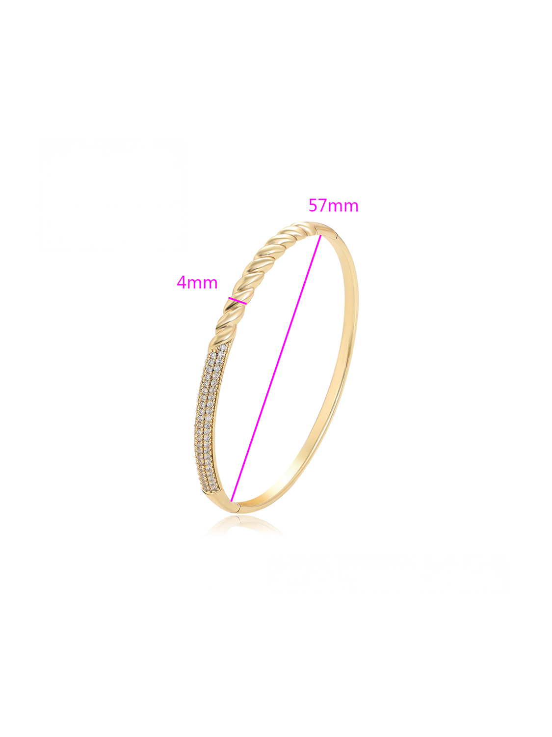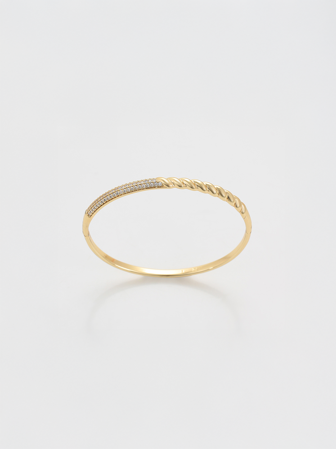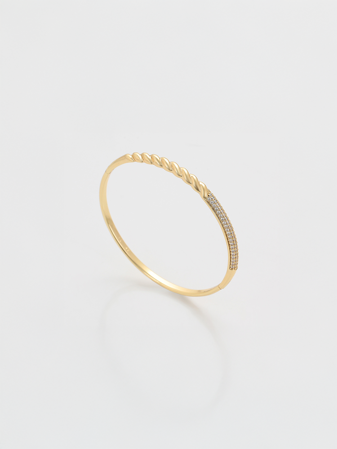 Το Elegant Twist είναι ένα κομψό βραχιόλι που συνδυάζει διαχρονικό στυλ και εκλεπτυσμένη σχεδίαση. Κατασκευασμένο από οικολογικό χαλκό σε απόχρωση χρυσού 14Κ, διαθέτει ένα στριφτό μοτίβο που αποπνέει φινέτσα και λαμπερά συνθετικά ζιργκόν για μια διακριτική λάμψη. Με ελαφρύ σχεδιασμό και διαστάσεις 57x4 mm, είναι το ιδανικό αξεσουάρ για καθημερινές εμφανίσεις ή ειδικές περιστάσεις.