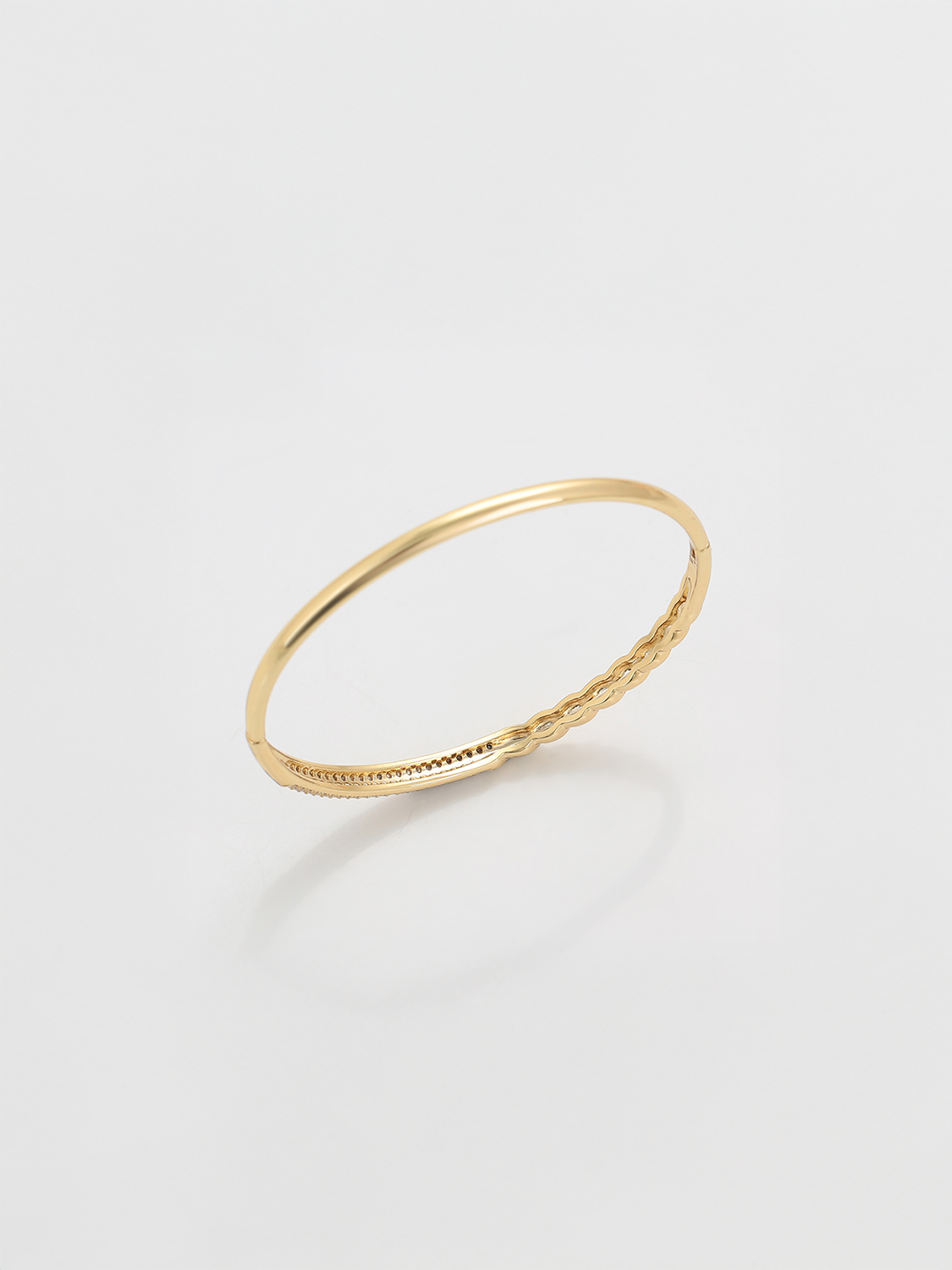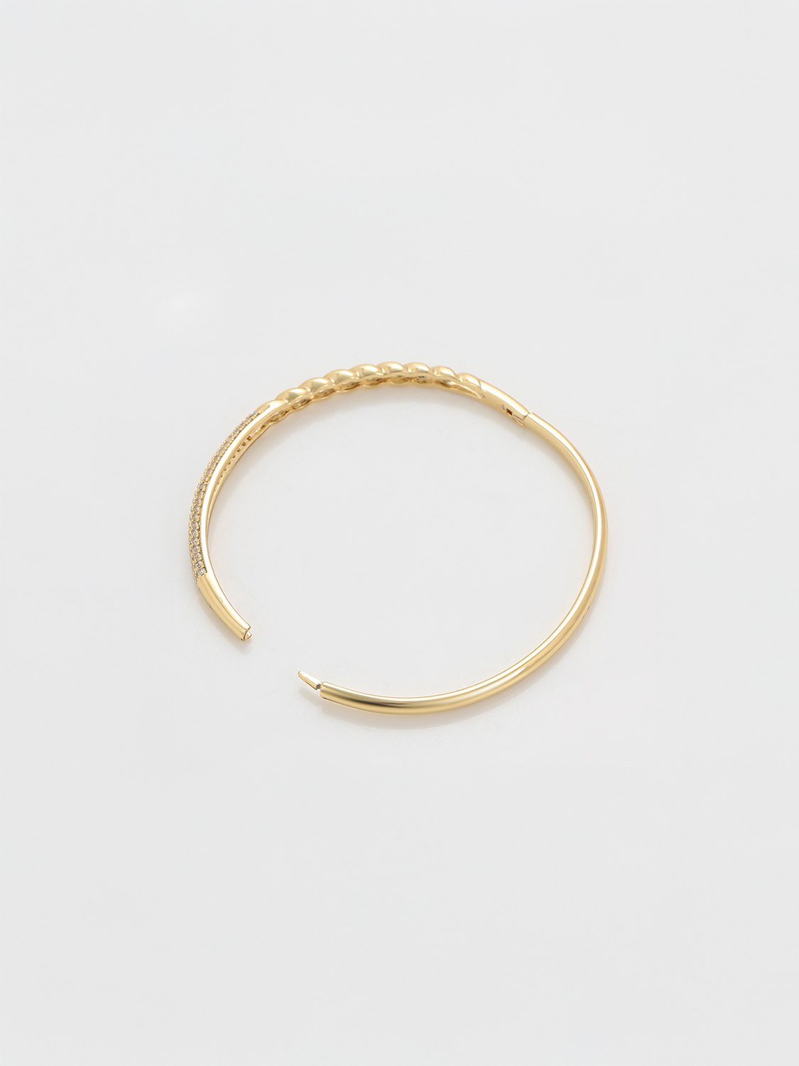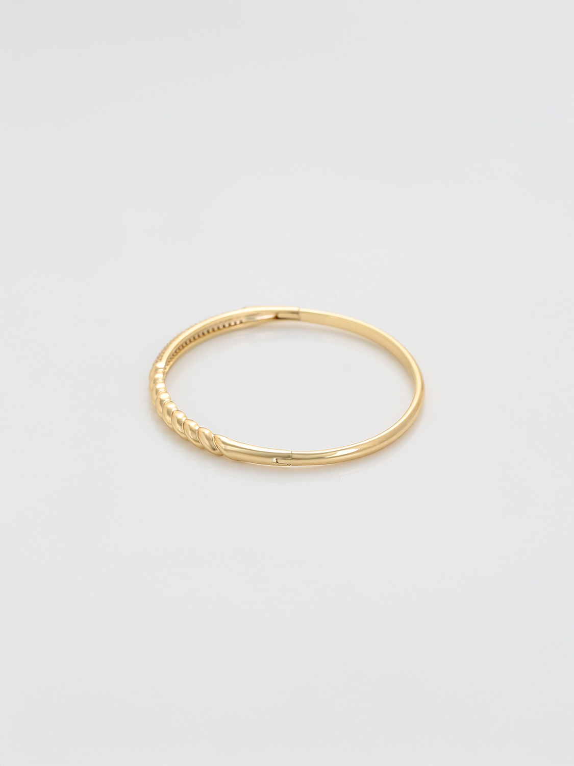 Το Elegant Twist είναι ένα κομψό βραχιόλι που συνδυάζει διαχρονικό στυλ και εκλεπτυσμένη σχεδίαση. Κατασκευασμένο από οικολογικό χαλκό σε απόχρωση χρυσού 14Κ, διαθέτει ένα στριφτό μοτίβο που αποπνέει φινέτσα και λαμπερά συνθετικά ζιργκόν για μια διακριτική λάμψη. Με ελαφρύ σχεδιασμό και διαστάσεις 57x4 mm, είναι το ιδανικό αξεσουάρ για καθημερινές εμφανίσεις ή ειδικές περιστάσεις.