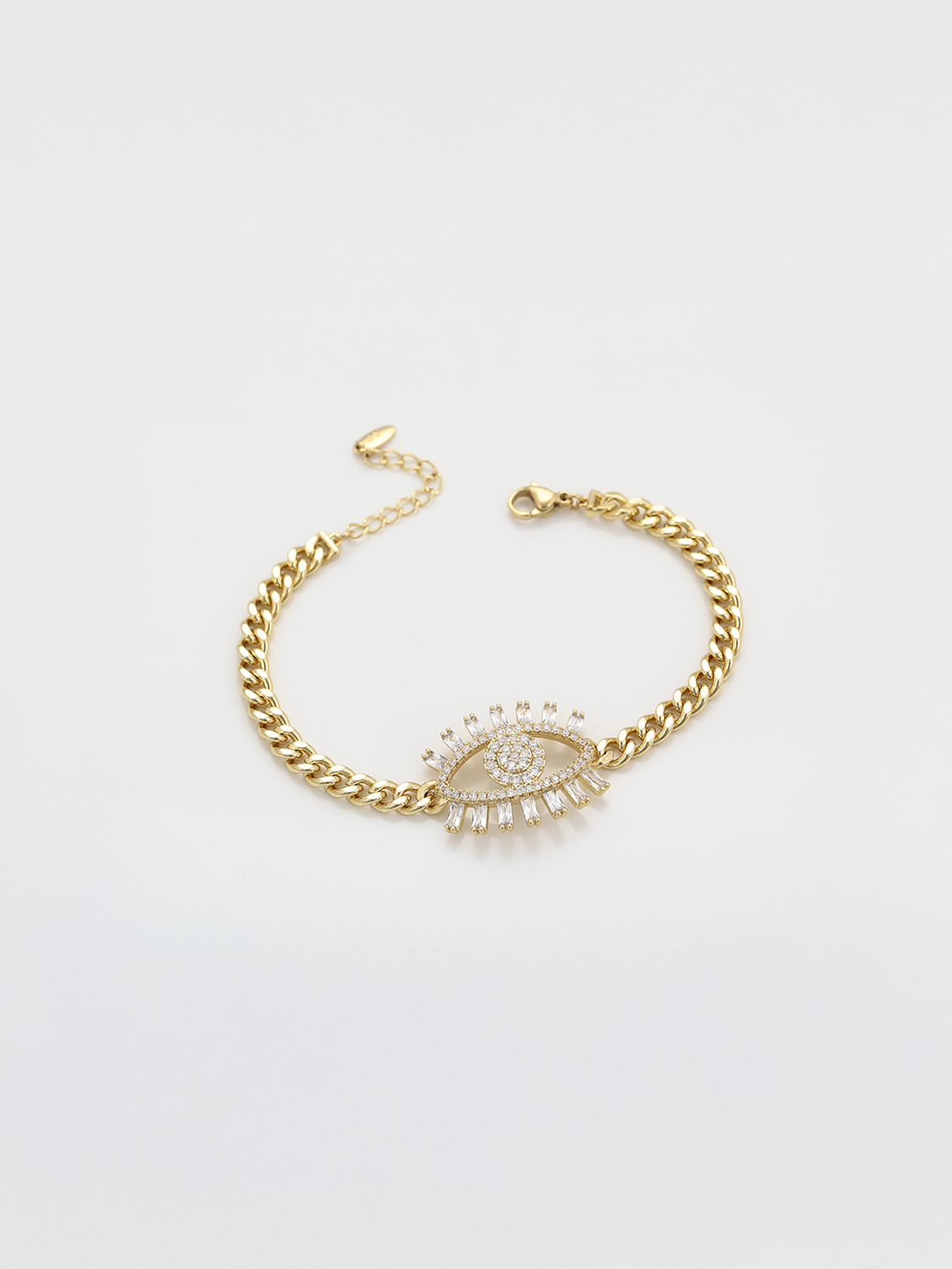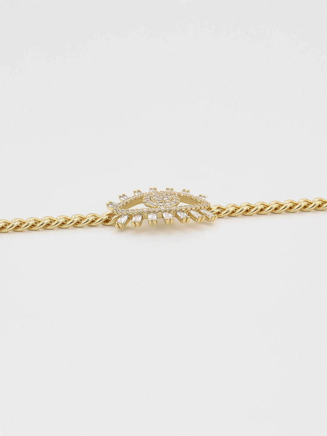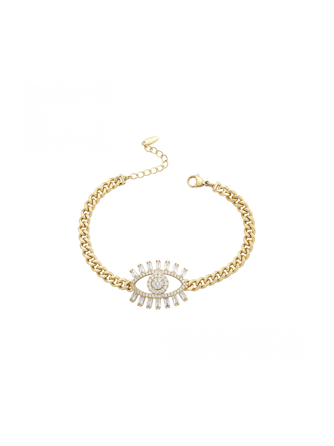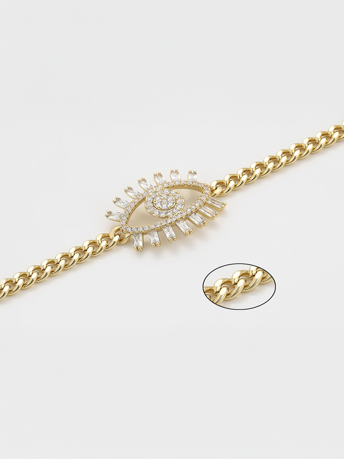 Προστασία και κομψότητα ενώνονται στο βραχιόλι Mystic Eye. Με ιδιαίτερο σχέδιο ματιού διακοσμημένο με λευκά ζιρκόν, αυτό το 14K επίχρυσο κόσμημα προσφέρει έναν αέρα μυστηρίου και λάμψη στο καθημερινό ή βραδινό σου look. Η αλυσίδα τύπου Cuban και το λαμπερό στοιχείο έχει έναν διαχρονικό συνδυασμό που εντυπωσιάζει.