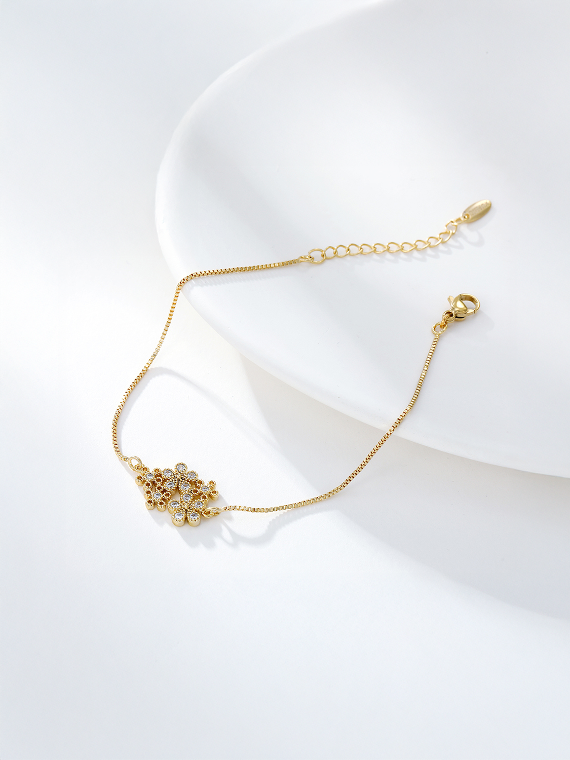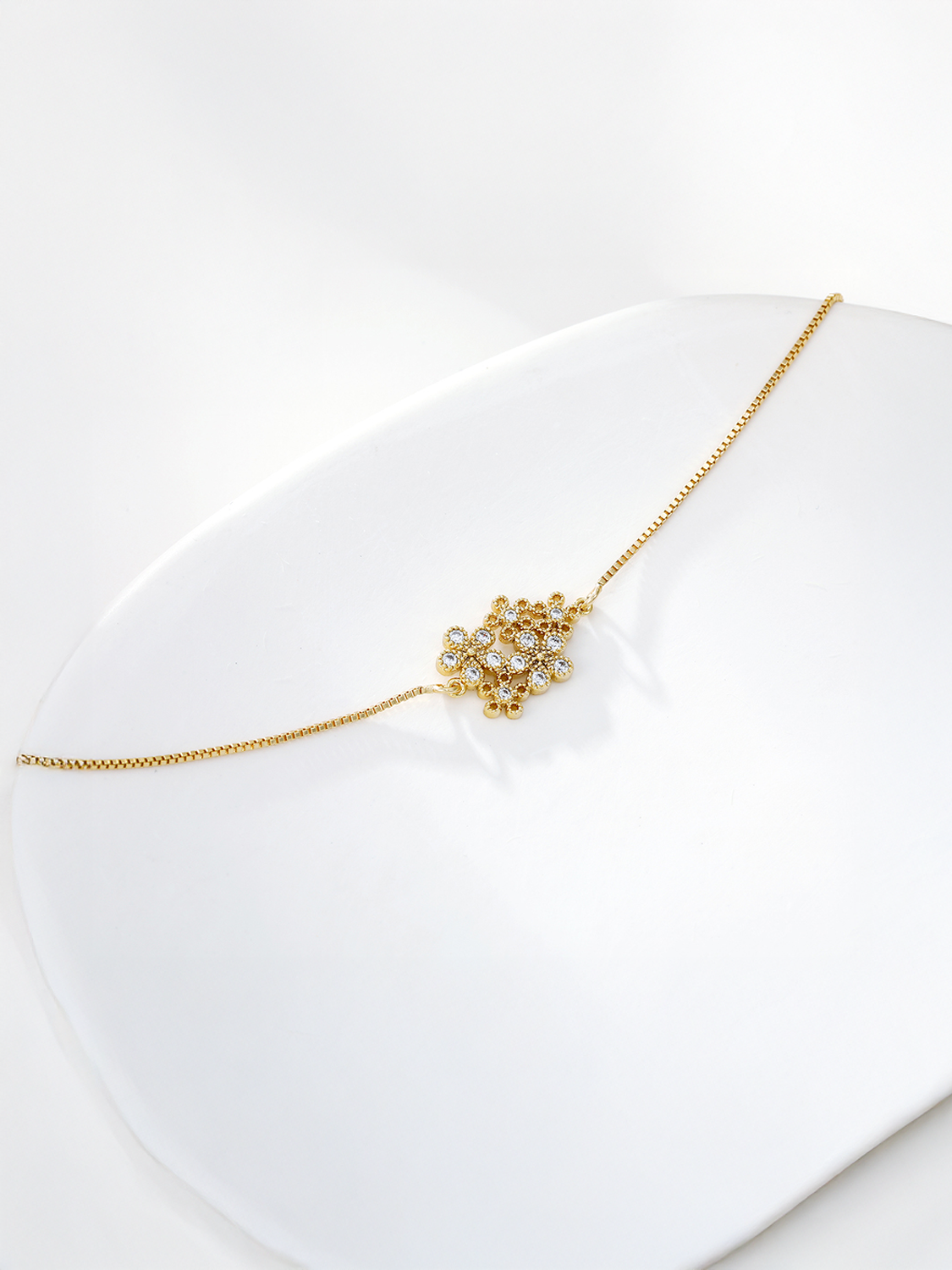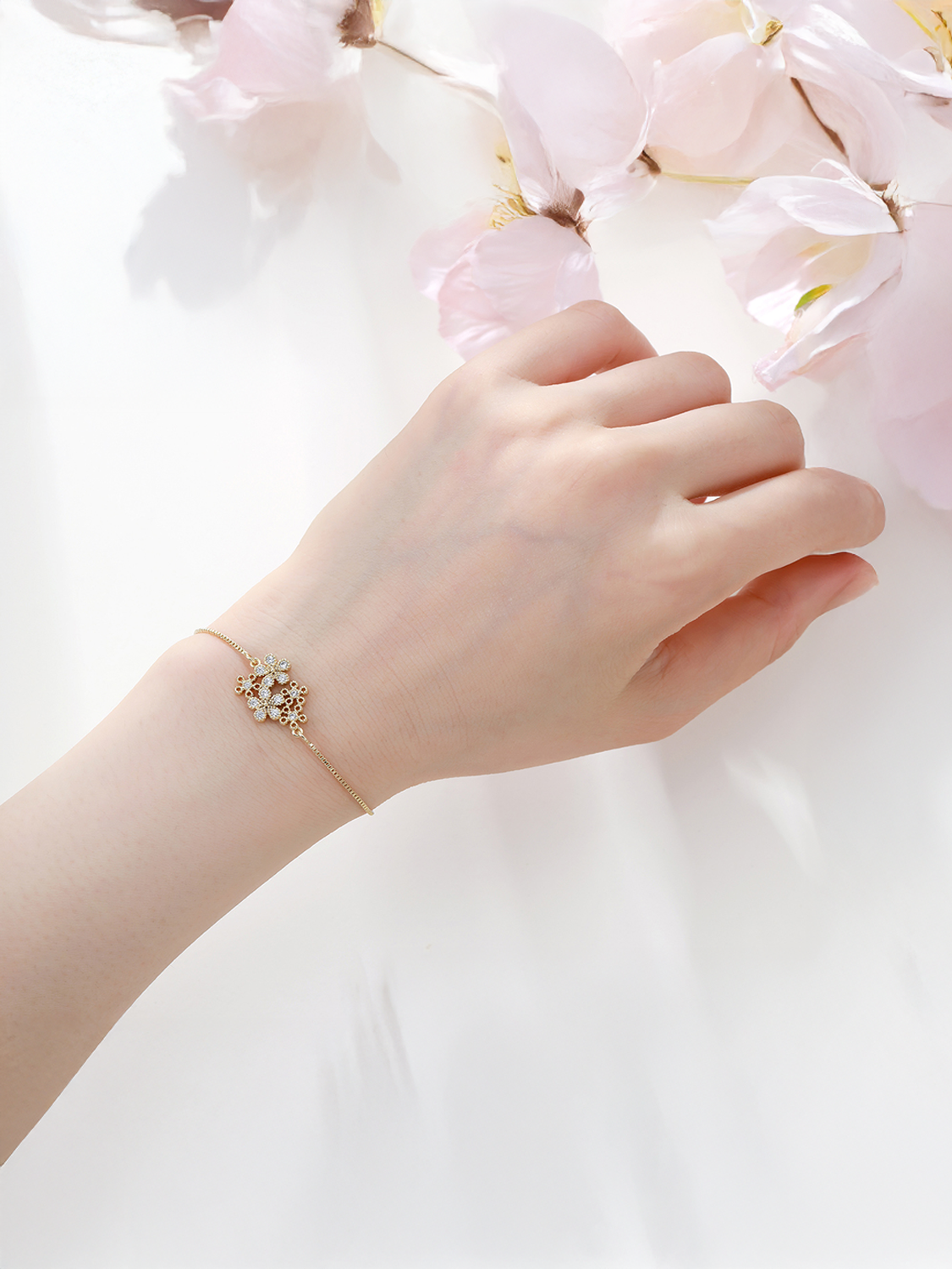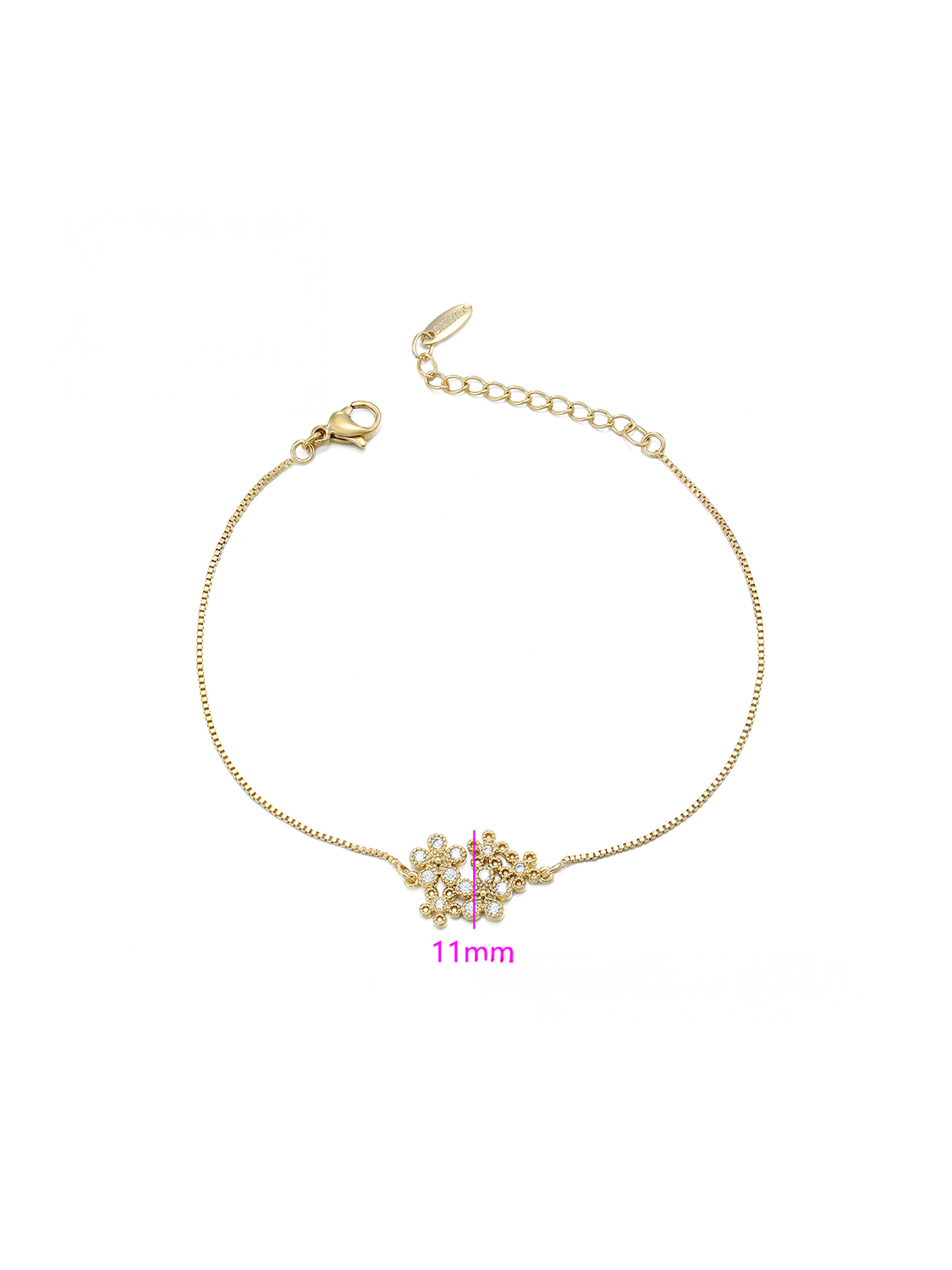 Το Βραχιόλι Snowflake Elegance αποπνέει ρομαντισμό και φινέτσα, εμπνευσμένο από τη μοναδική συμμετρία μιας νιφάδας χιονιού. Το κεντρικό μοτίβο είναι διακοσμημένο με λευκούς συνθετικούς κρυστάλλους CZ που ακτινοβολούν φως σε κάθε κίνηση. Το χρυσό κορδόνι με επιμετάλλωση 14Κ χρυσό χρώμα αναδεικνύει το ντελικάτο σχέδιο, προσφέροντας μια διακριτική πολυτέλεια για καθημερινή χρήση ή ως ξεχωριστό δώρο.