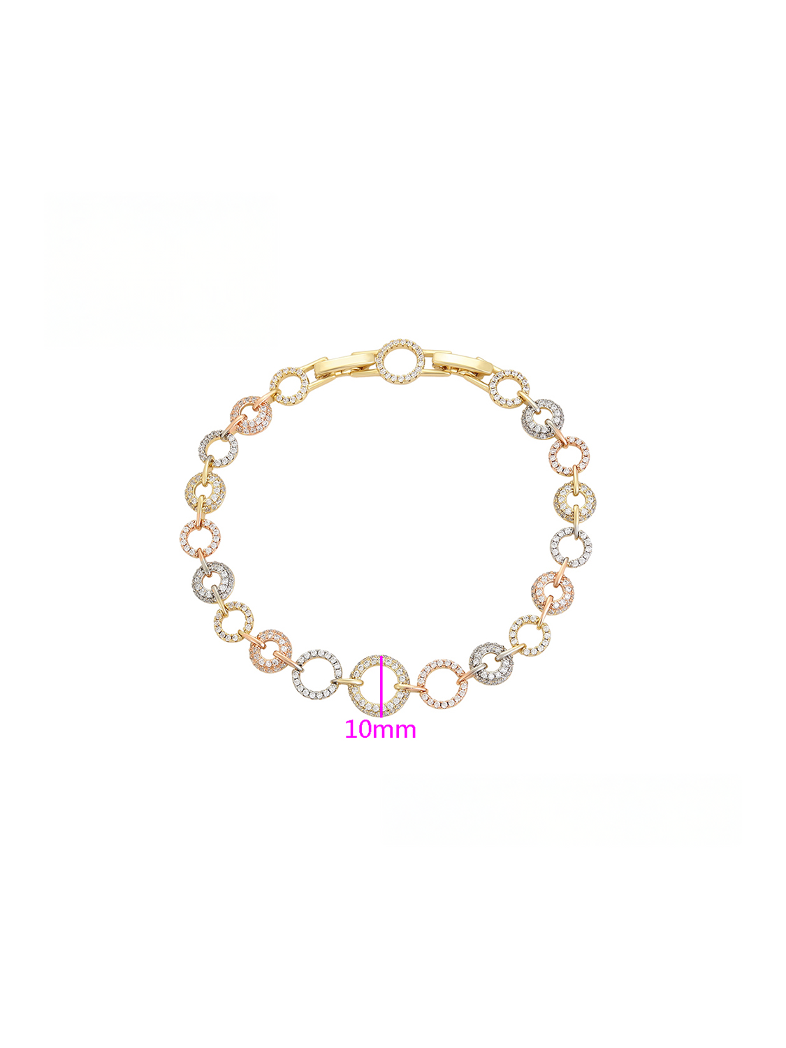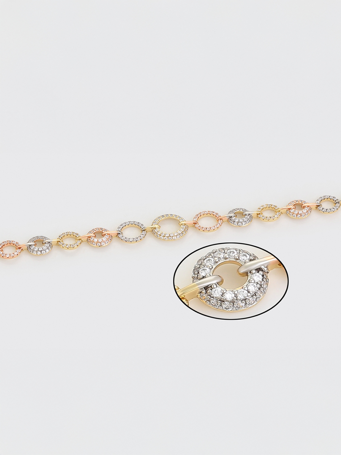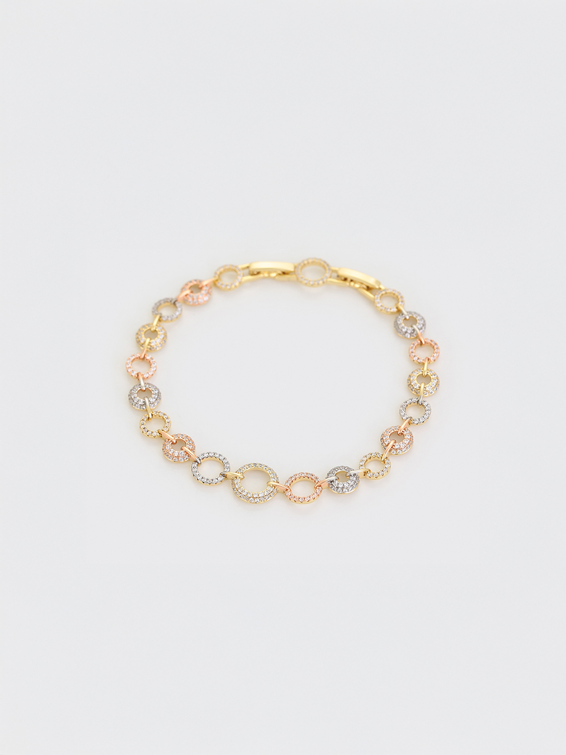 Το Βραχιόλι Trinity Gleam αποπνέει μία κομψή ισορροπία ανάμεσα στη λάμψη και το διαχρονικό στυλ. Σχεδιασμένο με συνδεόμενους κρίκους σε τρεις αποχρώσεις – ροζ, χρυσό και ασημί – διακοσμημένους με μικροσκοπικά λαμπερά ζιρκόν, αυτό το βραχιόλι αντανακλά φως από κάθε γωνία. Ιδανικό για γυναίκες που αγαπούν τη λεπτομέρεια και θέλουν να δώσουν μια ξεχωριστή νότα σε κάθε τους εμφάνιση.
