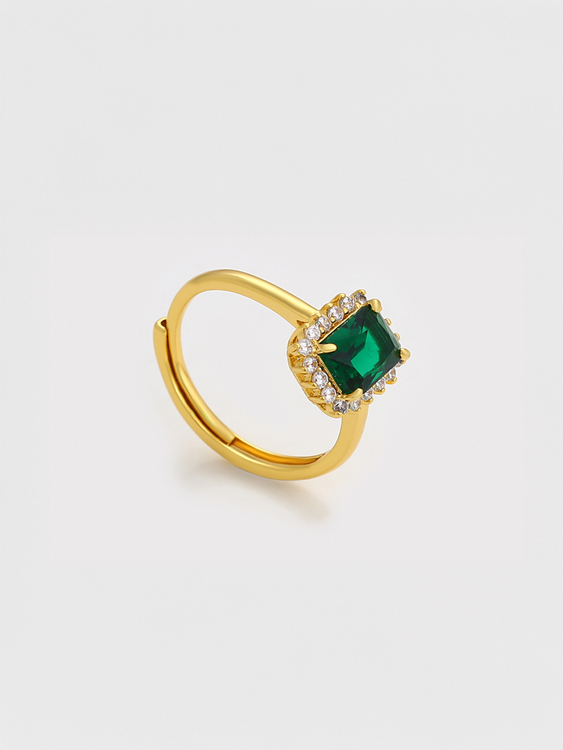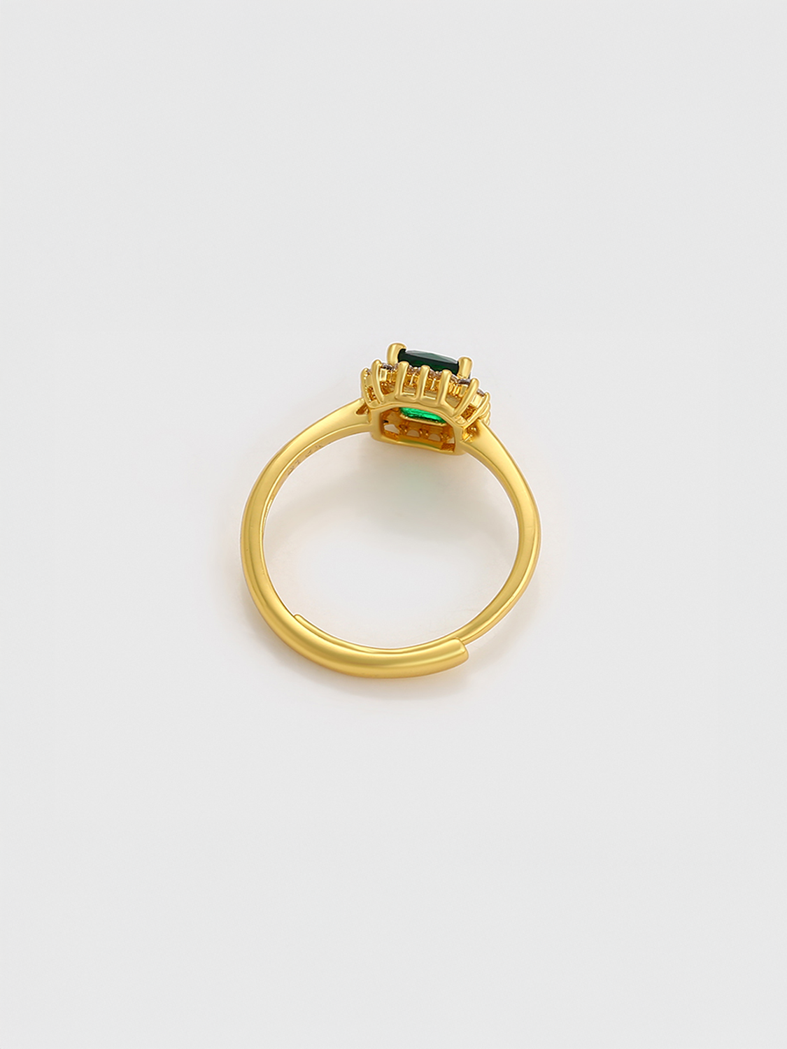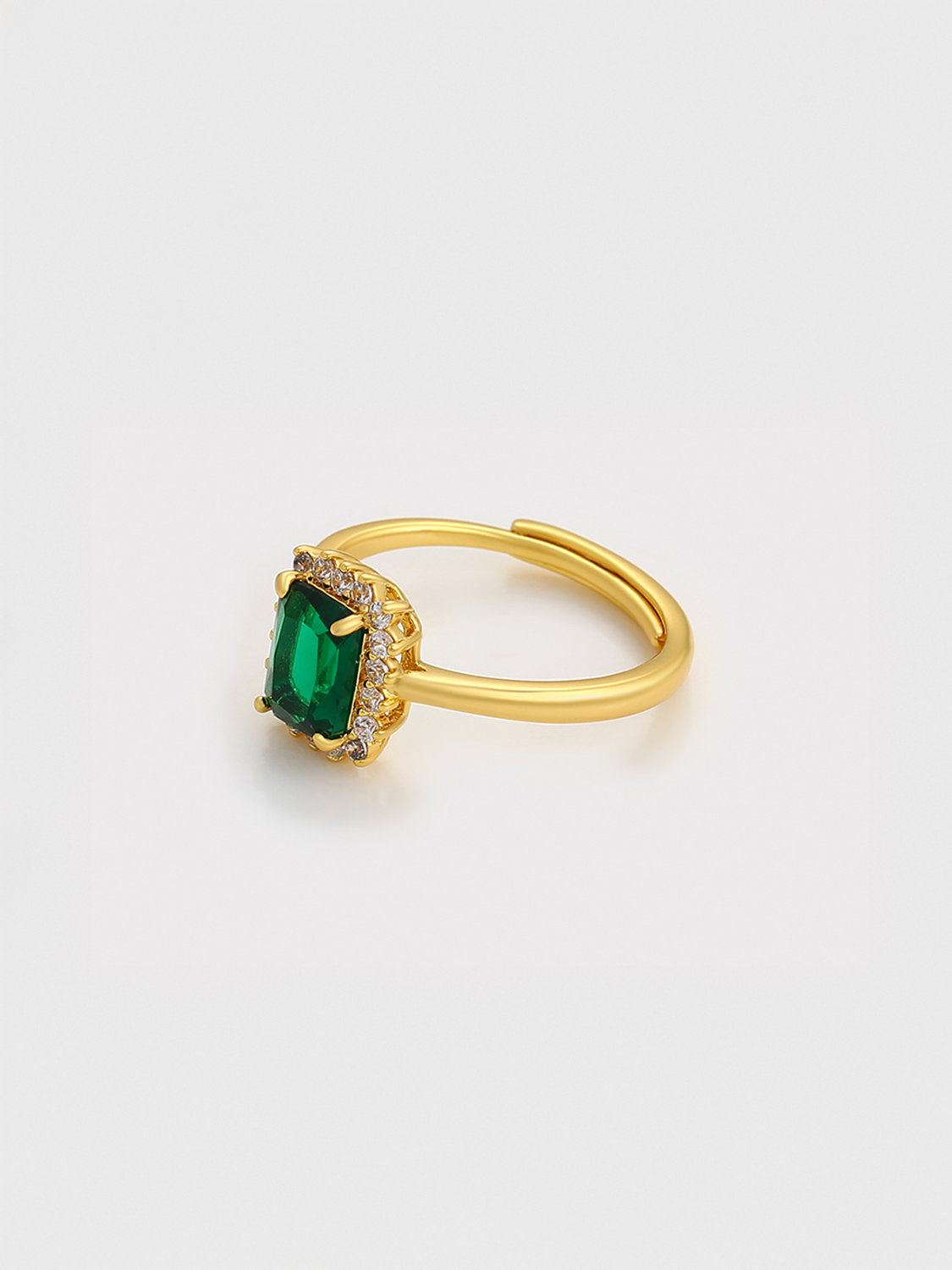 Το Emerald Empress είναι ένα κομψό δαχτυλίδι που συνδυάζει την αρχοντιά του πράσινου ζιρκόν με τη διαχρονική λάμψη του 24K χρυσού χρώματος. Στο κέντρο δεσπόζει ένα φωτεινό emerald cut ζιρκόν σε έντονη πράσινη απόχρωση, πλαισιωμένο από μικρά διαφανή κυβικά ζιρκόνια που ενισχύουν τη λάμψη του. Το σχέδιο του είναι προσαρμόσιμο, για εφαρμογή σε κάθε δάχτυλο. Ιδανικό για τις γυναίκες που λατρεύουν τα κλασικά κοσμήματα με έναν αέρα βασιλικής φινέτσας.