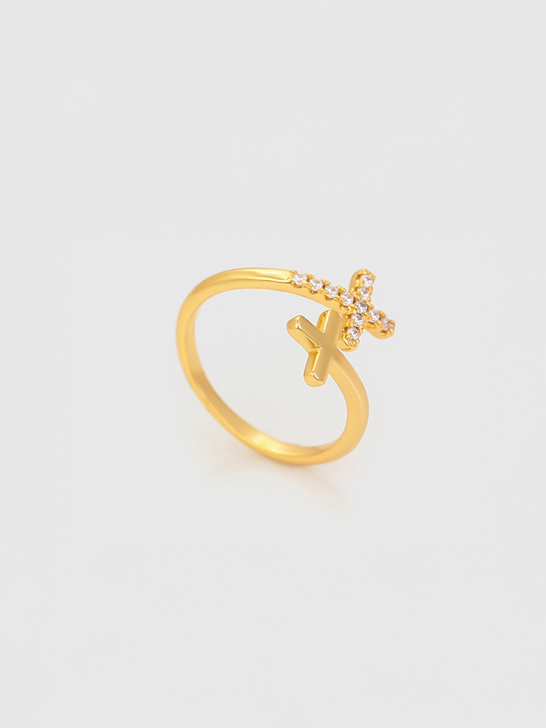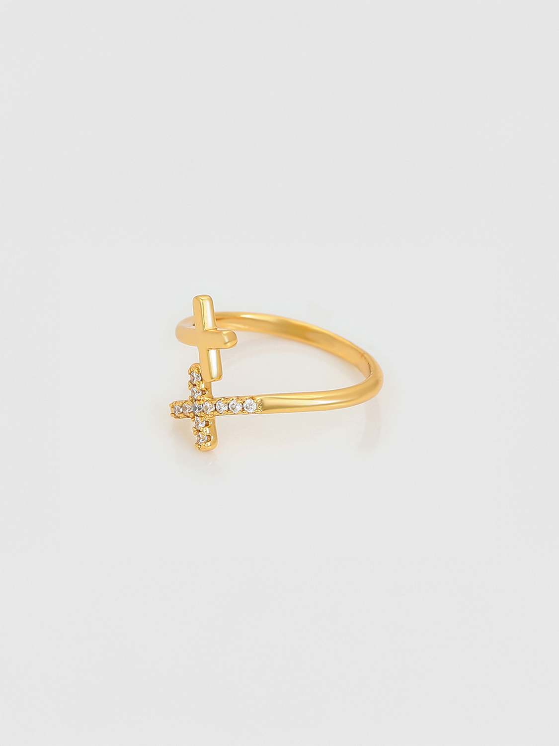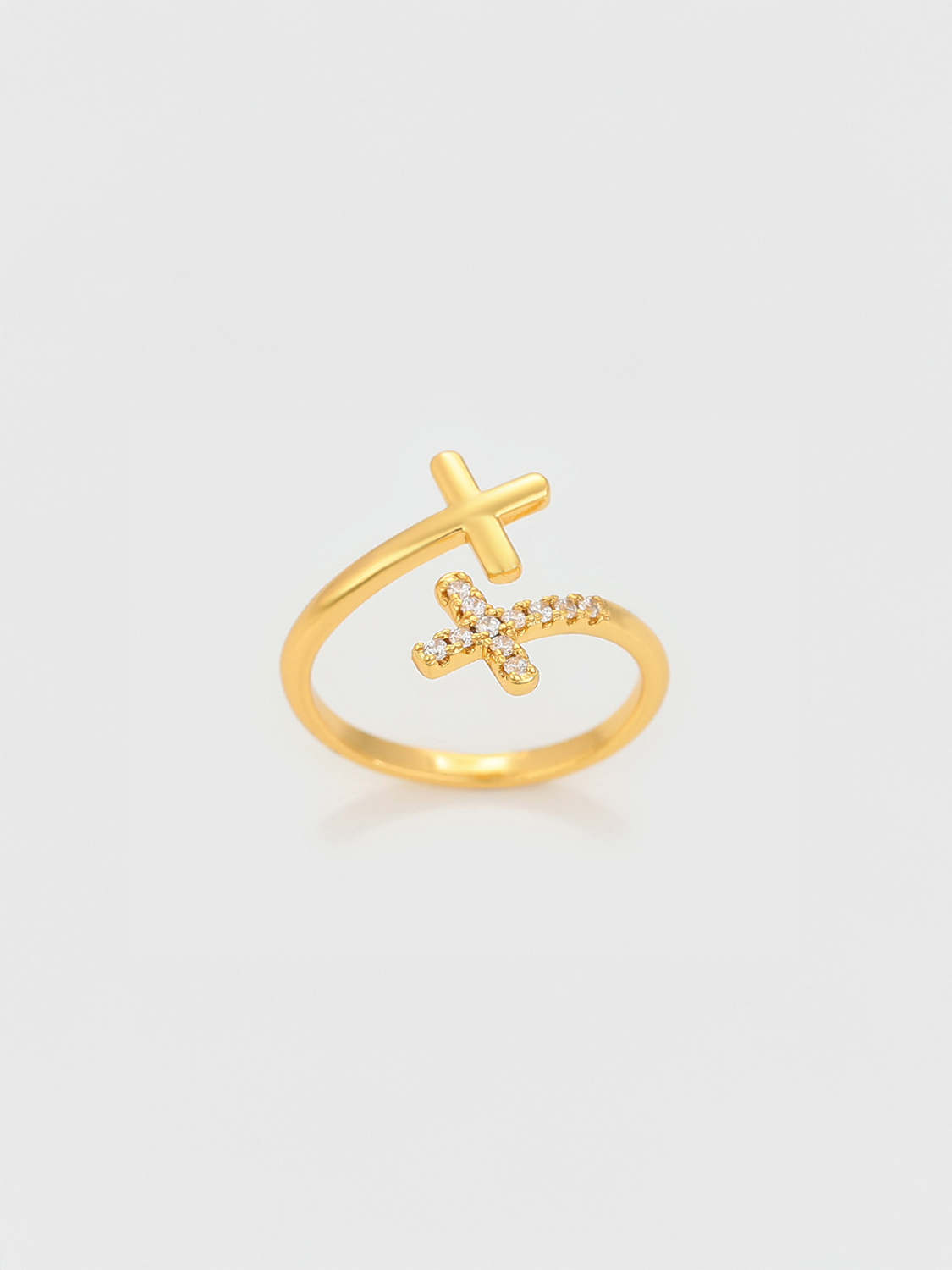 Το Faithful Grace είναι ένα εκλεπτυσμένο δαχτυλίδι που συνδυάζει την κομψότητα με το πνευματικό νόημα. Με δυο σταυρούς —ο ένας διακοσμημένος με αστραφτερές πέτρες και ο άλλος μινιμαλιστικός— συμβολίζει την ισορροπία μεταξύ της λάμψης και της απλότητας. Η επιμετάλλωση σε 24Κ χρυσό χρώμα προσδίδει πολυτέλεια, ενώ το λεπτό του σχεδιασμό το καθιστά ιδανικό για καθημερινή χρήση ή ως δώρο με ιδιαίτερο συμβολισμό.