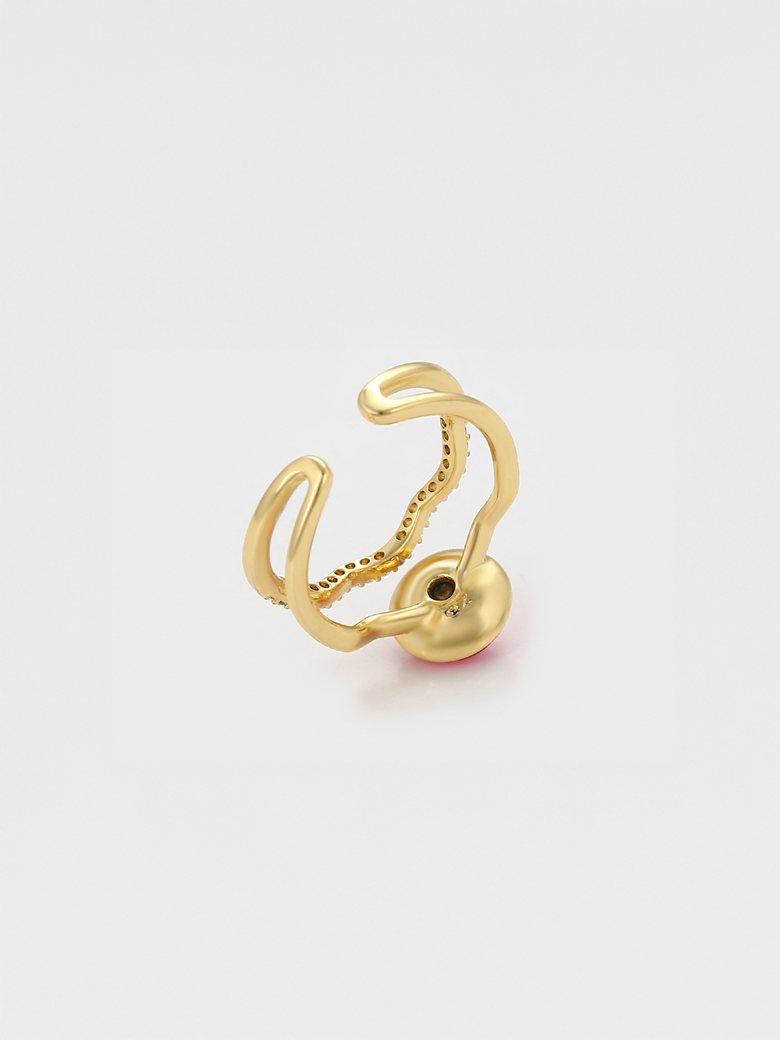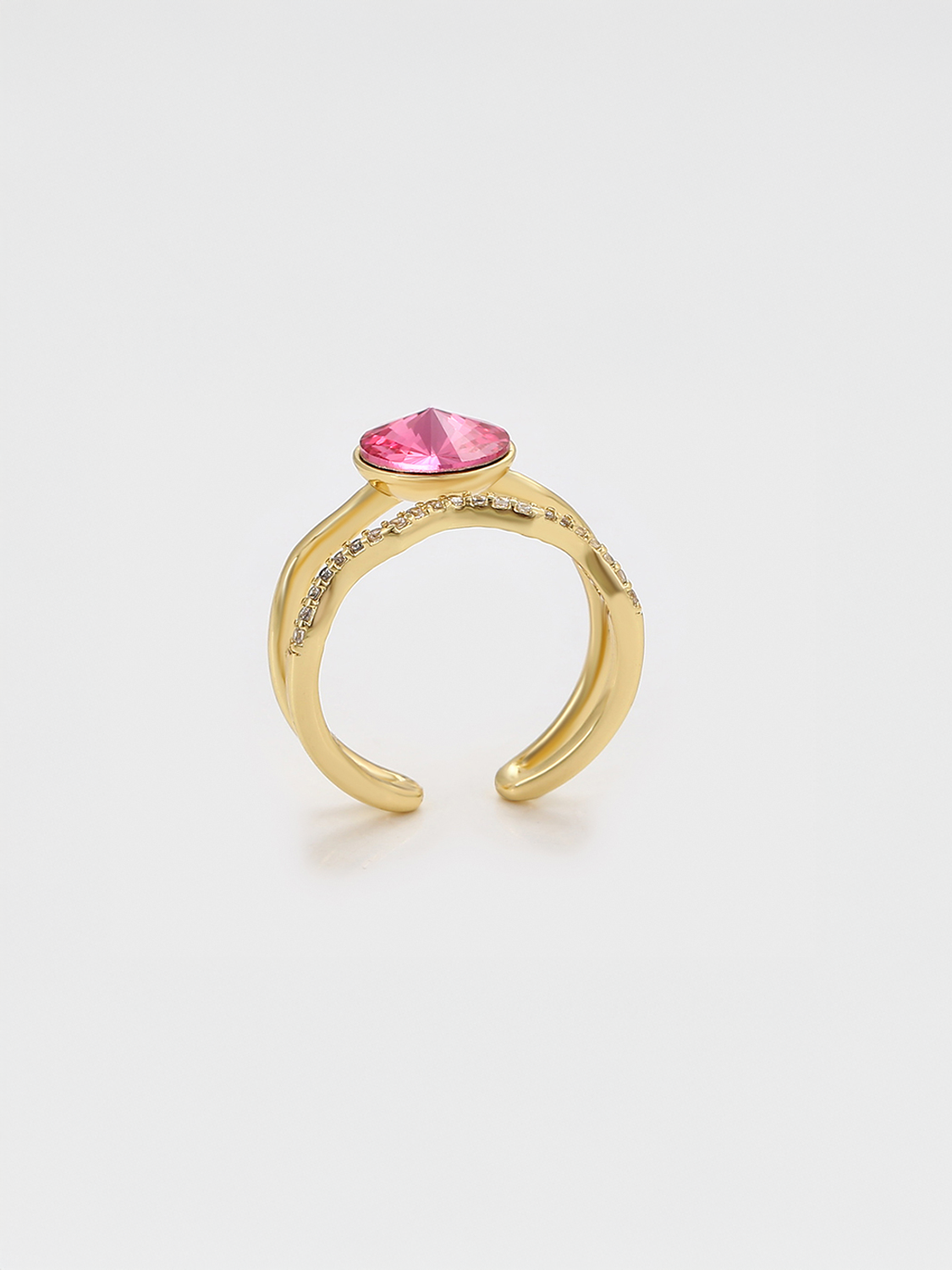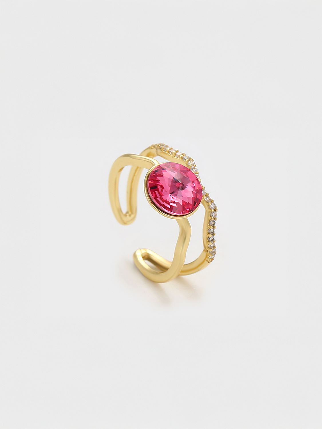 Το Δαχτυλίδι Pink Blaze ξεχωρίζει για το εντυπωσιακό ροζ κρύσταλλο κοπής brilliant που δεσπόζει στο κέντρο, αποπνέοντας δυναμισμό και θηλυκή αυτοπεποίθηση. Το παιχνιδιάρικα κυματιστό σχέδιο του δαχτυλιδιού αγκαλιάζει το δάχτυλο με δύο ανοιχτές άκρες, μία από τις οποίες είναι διακοσμημένη με διαφανείς λαμπερούς κρυστάλλους. Η επίστρωση με 14Κ χρυσό χρώμα ολοκληρώνει ένα μοντέρνο αλλά κομψό κόσμημα, ιδανικό για κάθε περίσταση.