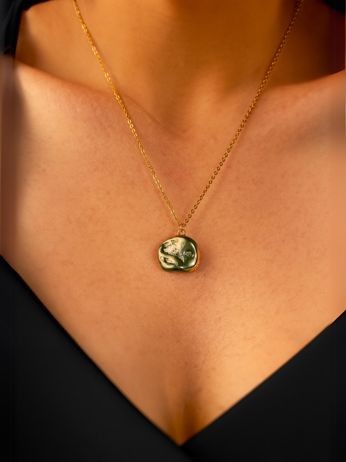 Αναδείξτε τη φυσική σας ομορφιά με το κολιέ "Nature's Charm". Το μοναδικό αυτό κόσμο διαθέτει ένα φυσικό σχέδιο που αποπνέει την αυθεντικότητα και τη γοητεία της φύσης. Το μενταγιόν σε χρώμα 24Κ χρυσού συνδυάζεται με μια όμορφη πράσινη πινελιά, δημιουργώντας ένα αρμονικό και κομψό αποτέλεσμα.