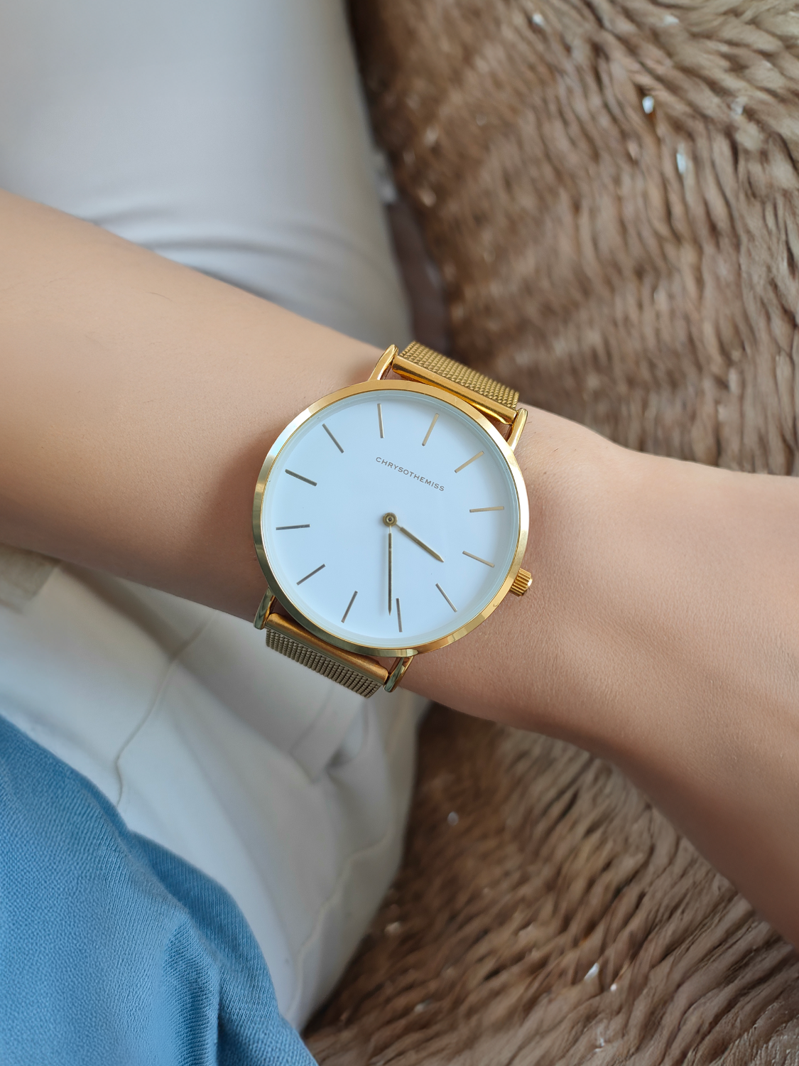 Αναδείξτε τη λάμψη σας με το Helia, ένα minimal ρολόι που αποπνέει καθαρότητα και εκλεπτυσμένη θηλυκότητα. Ο επιχρυσωμένος σκελετός και το φίνο μεταλλικό πλέγμα λουράκι προκαλεί ένα κόσμημα-ρολό ιδανικό για καθημερινές αλλά και ιδιαίτερες περιστάσεις. Το λευκό καντράν προσδίδει αίσθηση φωτός και αρμονίας, ενώ οι χρυσοί δείκτες συμπληρώνουν τέλεια το μινιμαλιστικό ύφος.