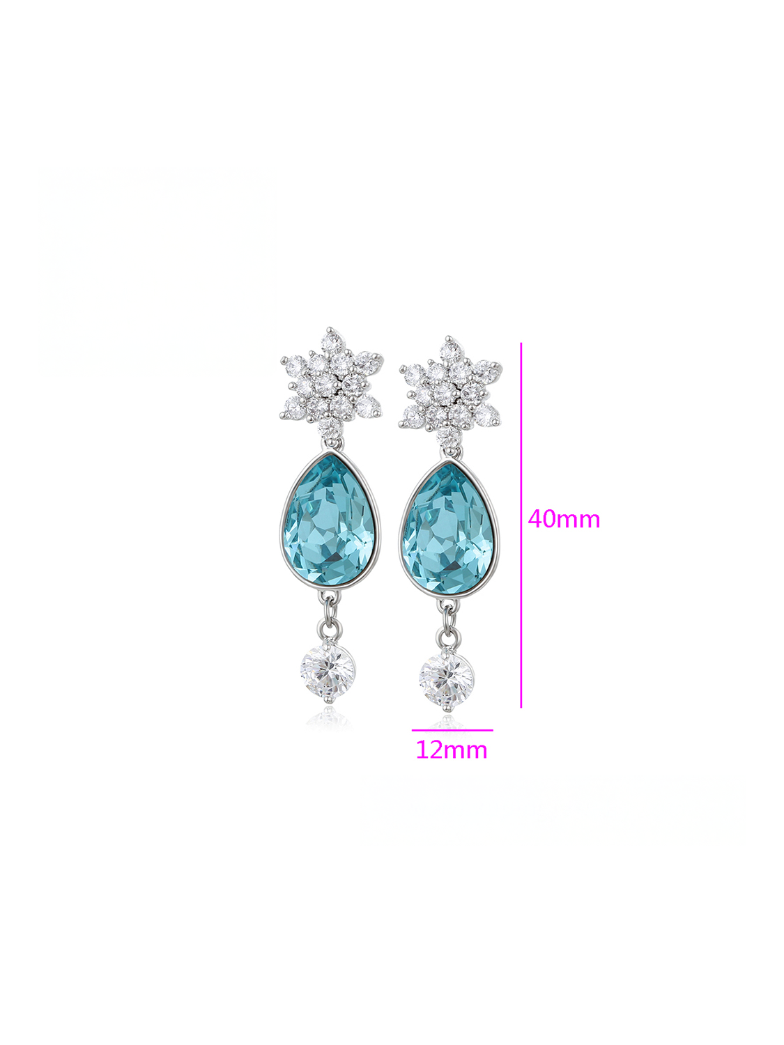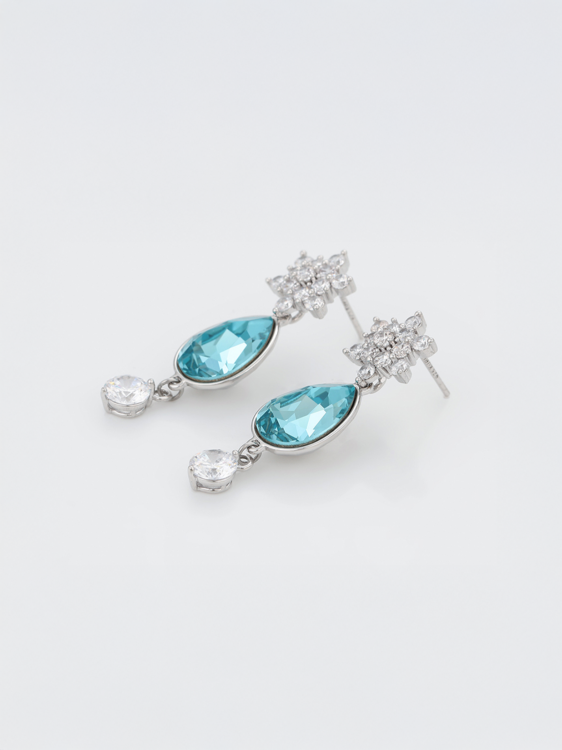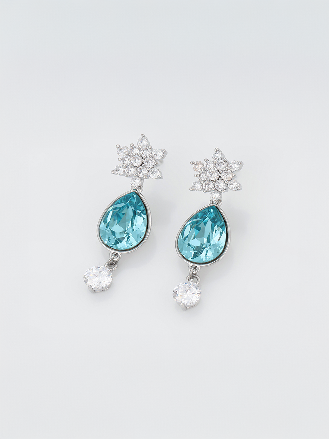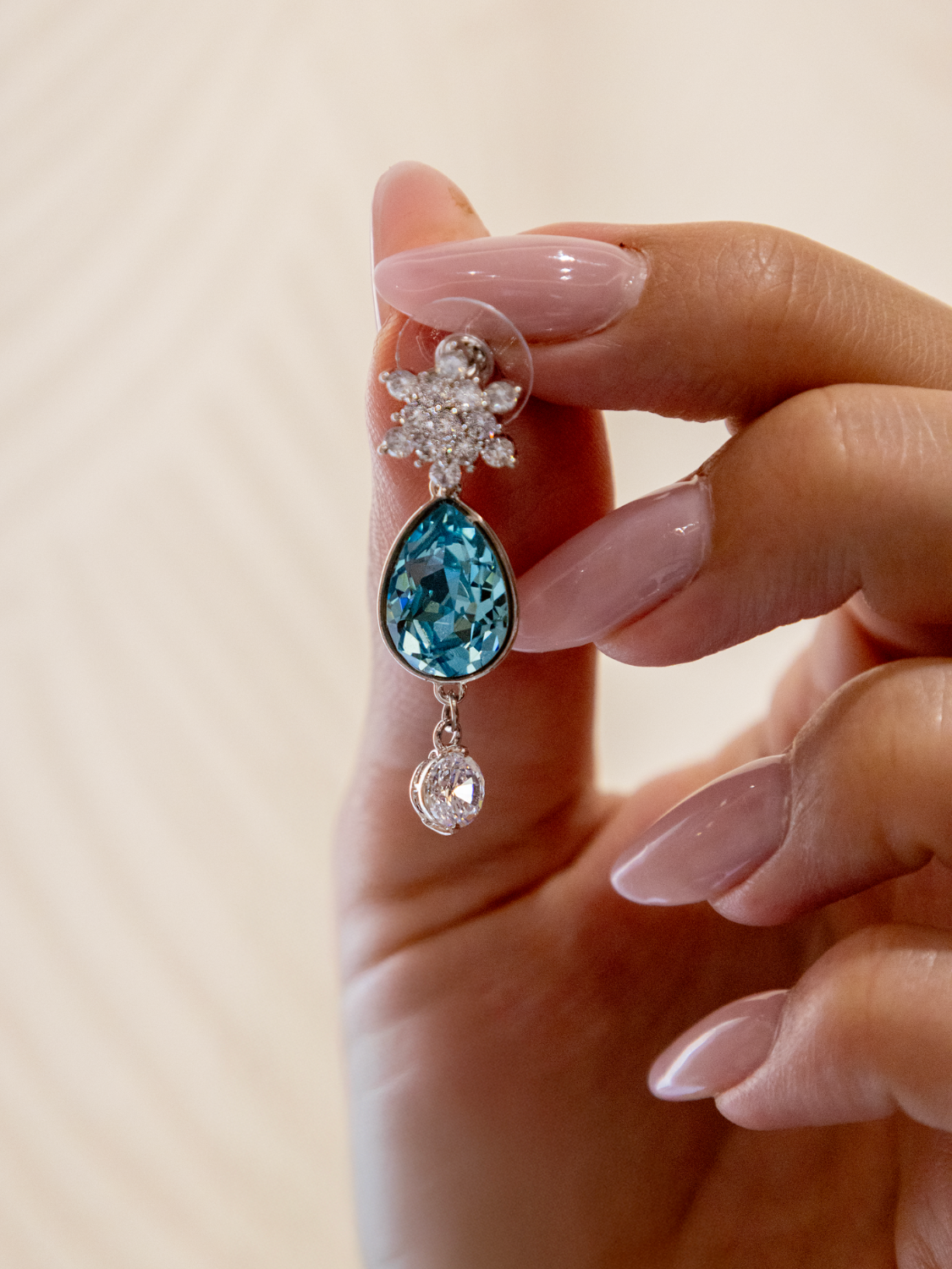 Η κεντρική θέση κατέχει η πέτρα σε σχήμα δάκρυ (14x10 mm) σε γαλάζιο χρώμα που θυμίζει καθαρή θάλασσα κάτω από το φως του φεγγαριού, ενώ η λευκή κρυστάλλινη λεπτομέρεια που πέφτει απαλά στο κάτω μέρος, ενισχύει τη ρομαντική και αριστοκρατική αισθητική.