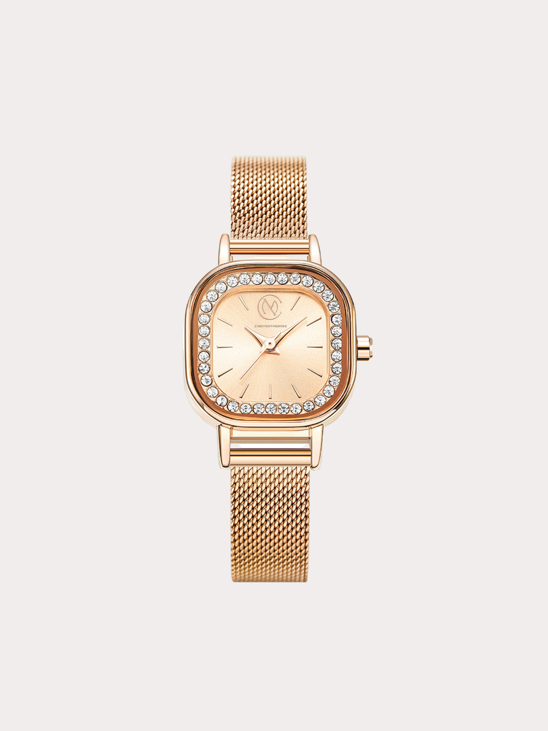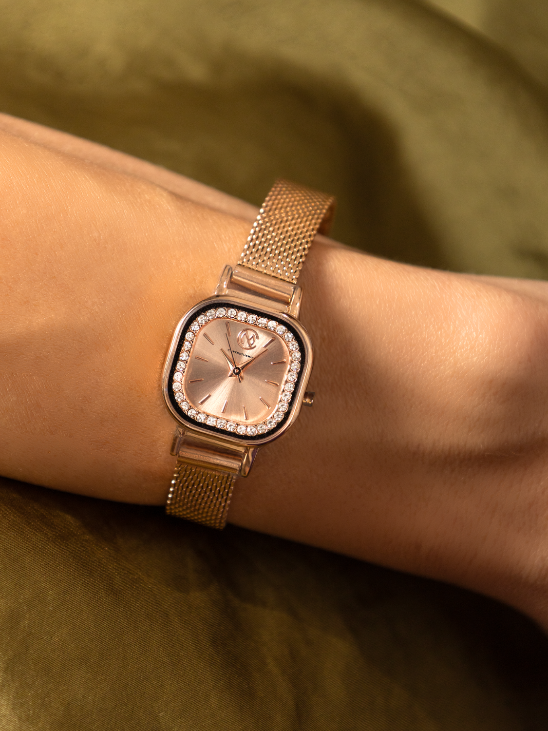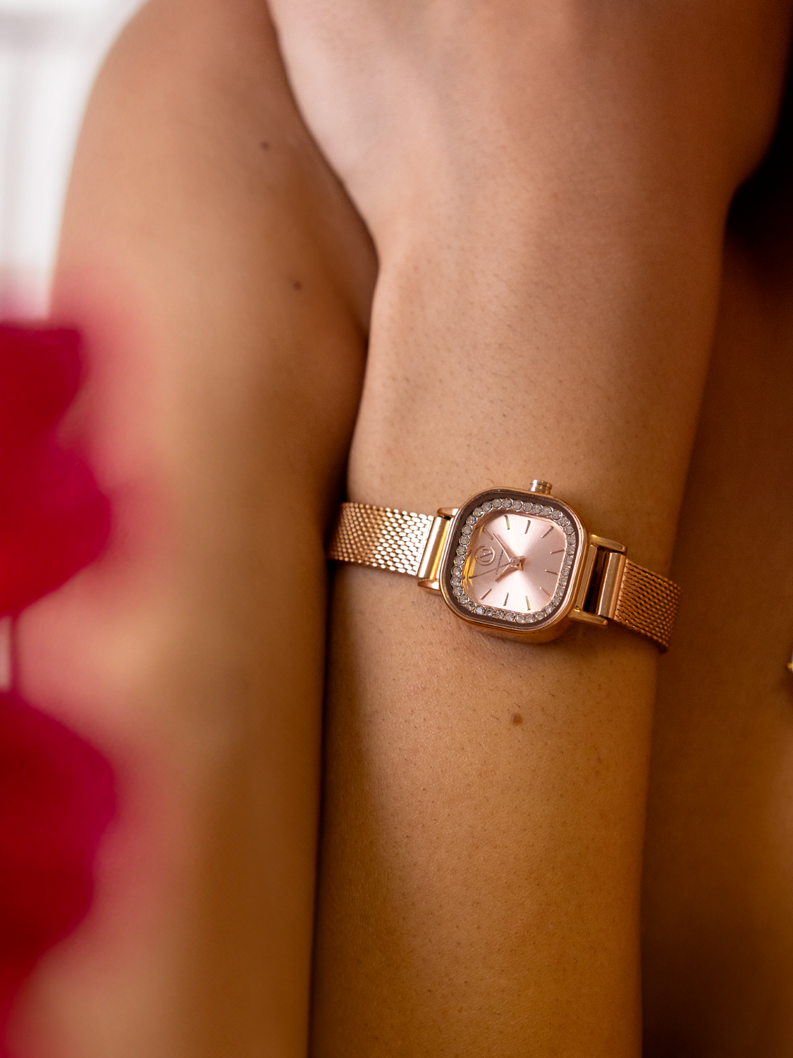 "Elegant Rose" Το ιδανικό γυναικείο ρολόι για τη σύγχρονη γυναίκα που αναζητά την απόλυτη εκφραστικότητα και κομψότητα. Με το μοναδικό του ροζ χρυσό φινίρισμα και το εκλεπτυσμένο σχεδιασμό, αυτό το ρολόι είναι μια απόλυτα θηλυκή προσθήκη για κάθε ενδυματολογική επιλογή. Το λεπτό λουράκι mesh προσθέτει μια μοντέρνα πινελιά, ενώ οι λαμπερές λεπτομέρειες που περιβάλλουν το καντράν προσφέρουν μια διακριτική λάμψη. Αποκτήστε το ρολόι που κάθε γυναίκα ποθεί, ιδανικό για εκείνες που επιδιώκουν ένα στυλάτο και διαχρονικό αξεσουάρ για την καθημερινή τους εμφάνιση.