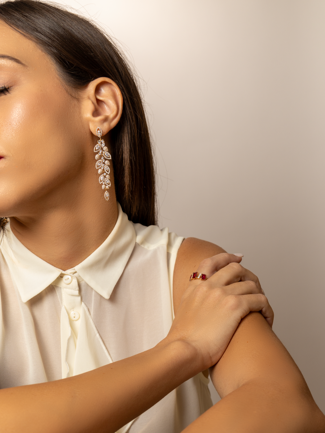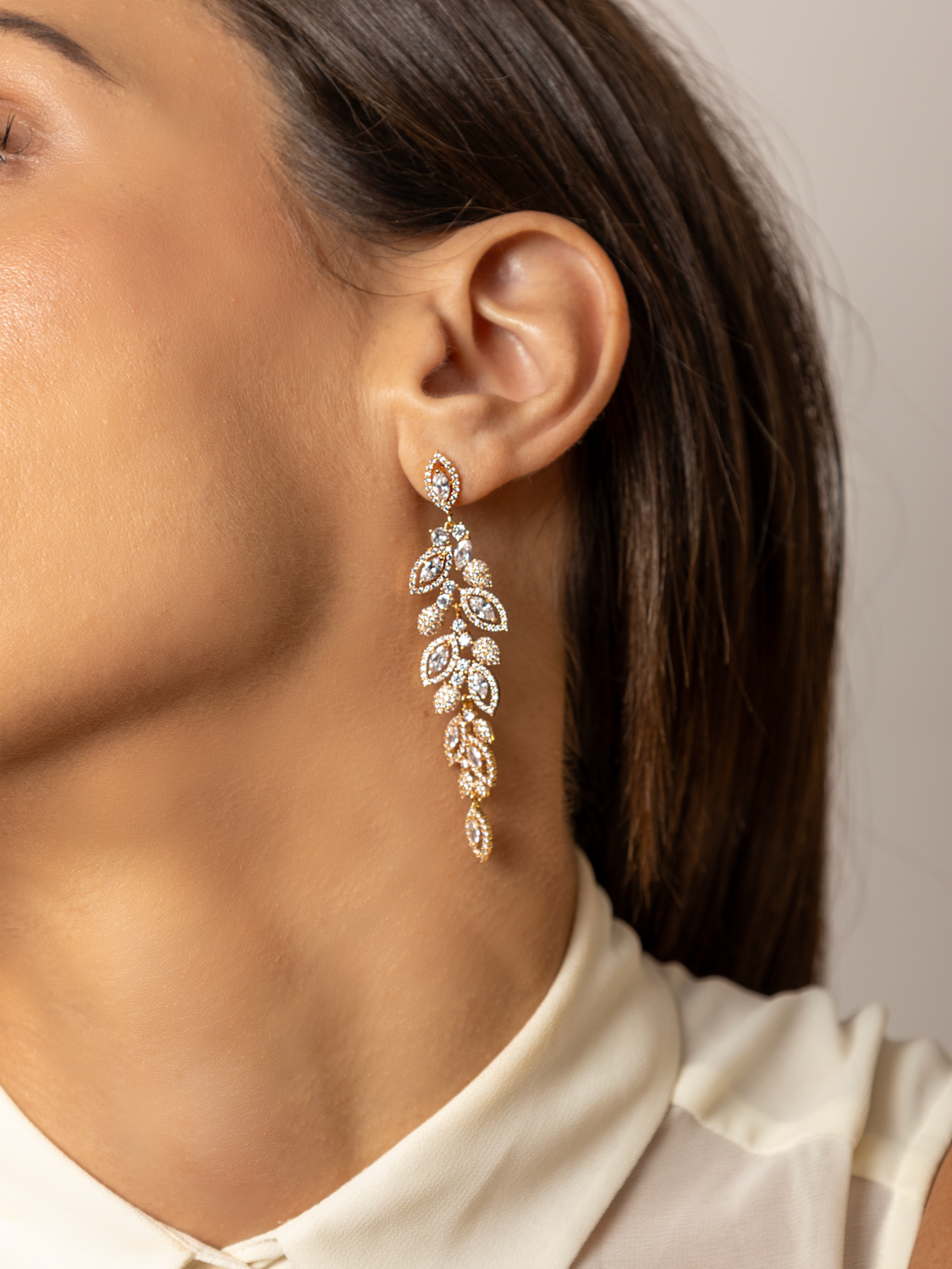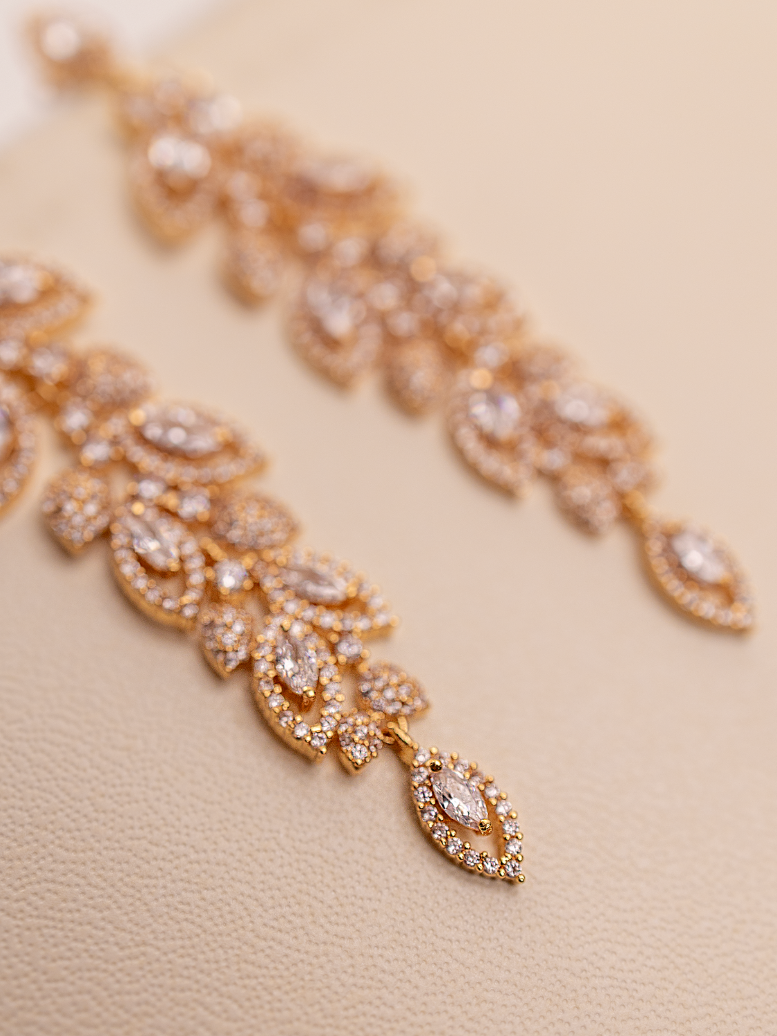 Τα σκουλαρίκια "Gilded Petals" είναι ένα έργο τέχνης που αναδεικνύει την ανθισμένη κομψότητα. Το πλούσιο σχέδιο με τις ακριβείς λεπτομέρειες αντλεί έμπνευση από τη μαγεία ενός κήπου που βρίσκεται σε πλήρη άνθιση, με κάθε πέταλο να είναι προσεκτικά διακοσμημένο με μικρά φωτεινά στοιχεία που αντανακλούν το φως με κάθε κίνηση. Είτε πρόκειται για μια επίσημη εκδήλωση είτε για μια σημαντική προσωπική στιγμή, τα "Gilded Petals" προσθέτουν μια ξεχωριστή αίσθηση πολυτέλειας και αισθητικής αποπλάνησης.