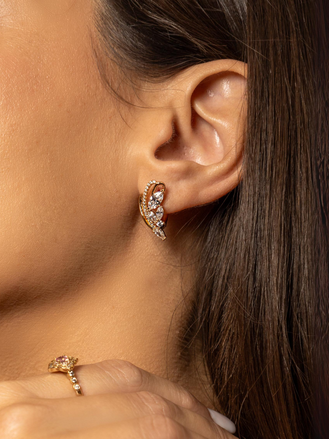 Αναδείξτε τη λάμψη και την κομψότητα σας με τα σκουλαρίκια "Butterfly Grace". Αυτά τα κομψά και στυλάτα σκουλαρίκια διαθέτουν λαμπερές συνθετικές πέτρες ζιργκόν (CZ) και είναι επιχρυσωμένα με 18 καρατίων χρυσό. Ιδανικά για κάθε επίσημη ή καθημερινή σας εμφάνιση, προσδίδουν μια αίσθηση πολυτέλειας και φινέτσας.