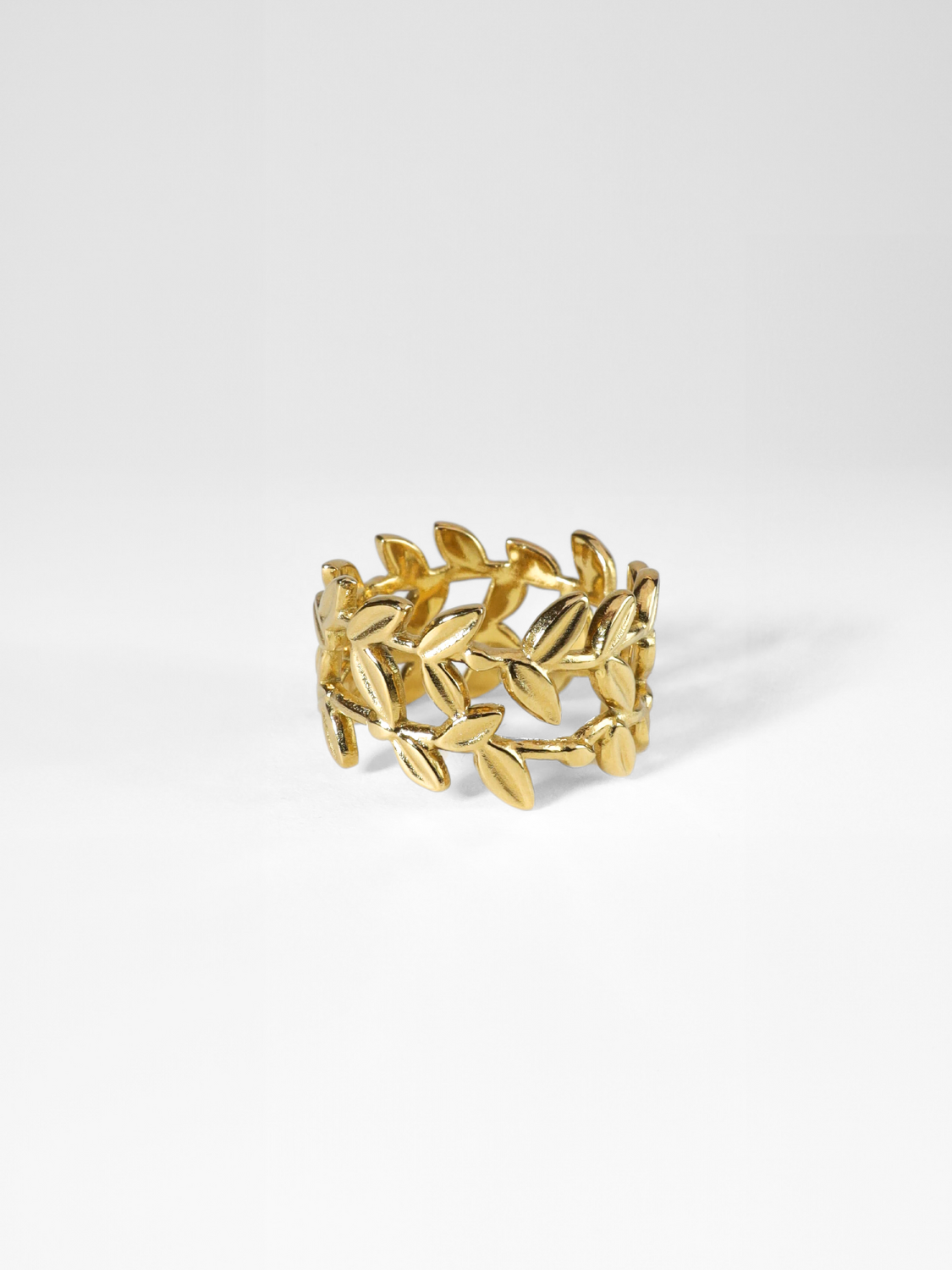 Το δαχτυλίδι 'Golden Laurel' αποτελεί έναν ύμνο στη διαχρονική κομψότητα. Εμπνευσμένο από τα δάφνινα στεφάνια της αρχαίας εποχής, αυτό το κόσμημα συνδυάζει την ευγένεια του χρυσού με την αριστοκρατική απλότητα των φύλλων της δάφνης. Το δαχτυλίδι αυτό υποβάλλεται να προσθέσει μια λάμψη θριάμβου σε κάθε εμφάνιση σας.