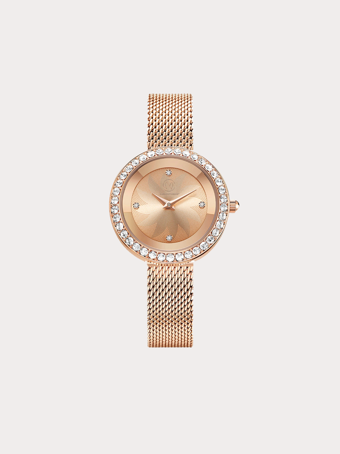 «Χρυσός ψίθυρος». Το γυναικείο ρολόι που μεταφράζει την λάμψη του ήλιου σε ένα διακριτικό και κομψό αξεσουάρ. Η απαλή ροζ χρυσή απόχρωση του καντράν εναρμονίζεται υπέροχα με το μεταλλικό λουράκι, προσδίδοντας μια αίσθηση ανεπιτήδευτης πολυτέλειας. Το "Golden Whisper" είναι το ιδανικό ρολόι για όσους επιθυμούν να προσθέσουν μια διακριτική ομορφιά στην καθημερινότητα, με μια αύρα που ψιθυρίζει αισθητική και αρμονία.