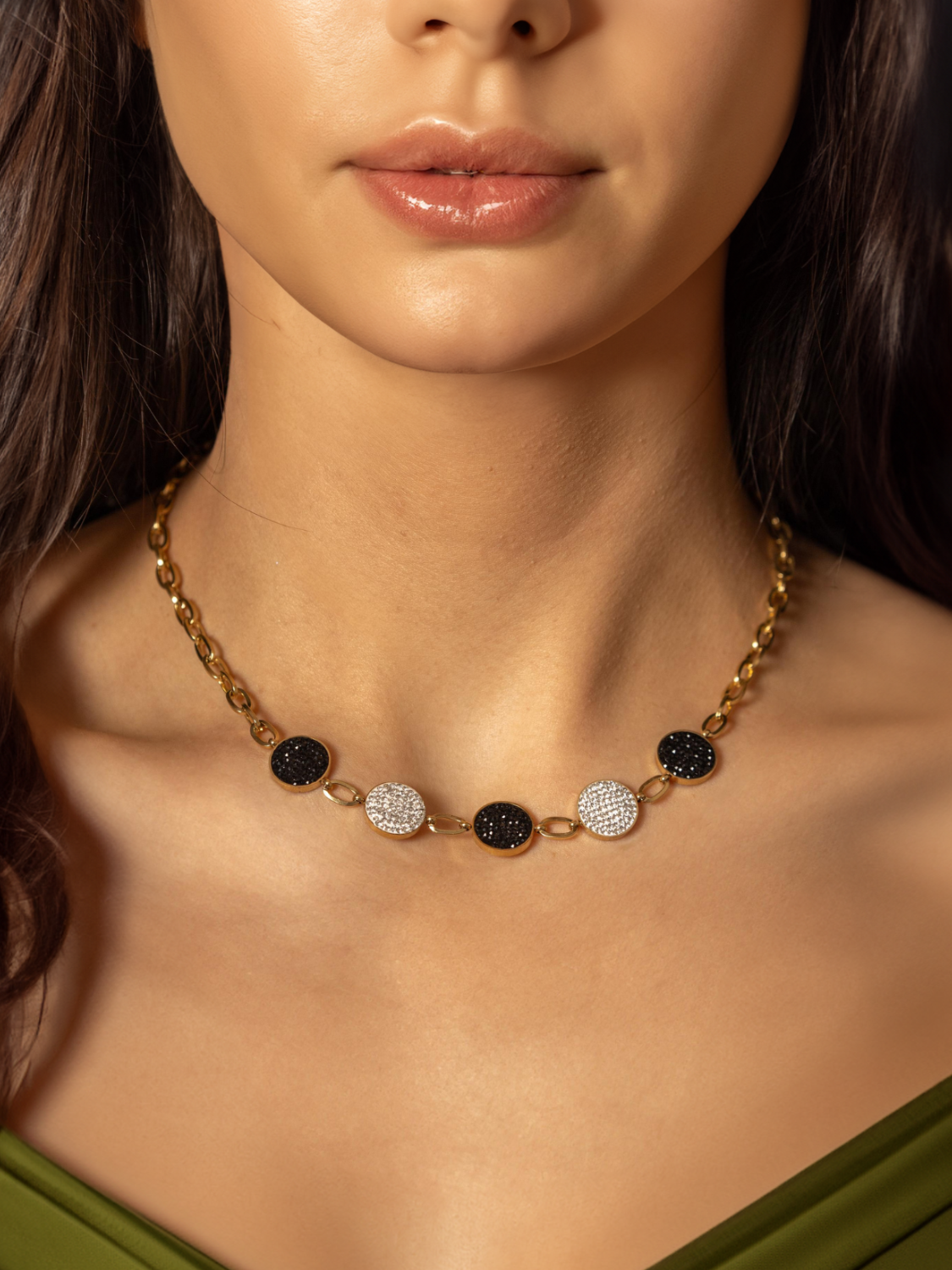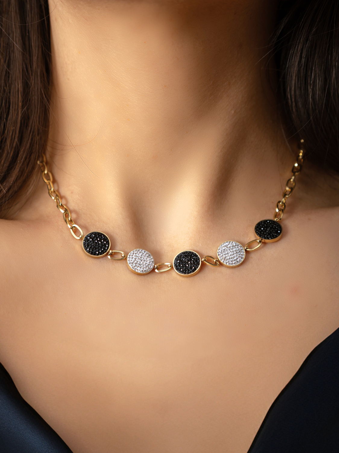 Το κολιέ 'Nocturnal Symphony' είναι ένα έργο τέχνης που ενώνει τη νυχτερινή γοητεία με την αστραφτερή κομψότητα. Η εναλλαγή μεταξύ των πλούσιων μαύρων και των λαμπερών λευκών δημιουργεί μια αρμονική σύνθεση, που θυμίζει τον μαγικό ρυθμό μιας κομψής μουσικής μελωδίας. Τα ενσωματωμένα στοιχεία αντανακλούν το φως με έναν τρόπο που επιτυγχάνεται μια διακριτική αλλά αποφασιστική παρουσία. Το 'Nocturnal Symphony' είναι το ιδανικό αξεσουάρ για εκείνες που θέλουν να εκφράσουν τη δική τους ιστορία μέσα από την πολυτέλεια και τον σχεδιασμό των κοσμημάτων τους.