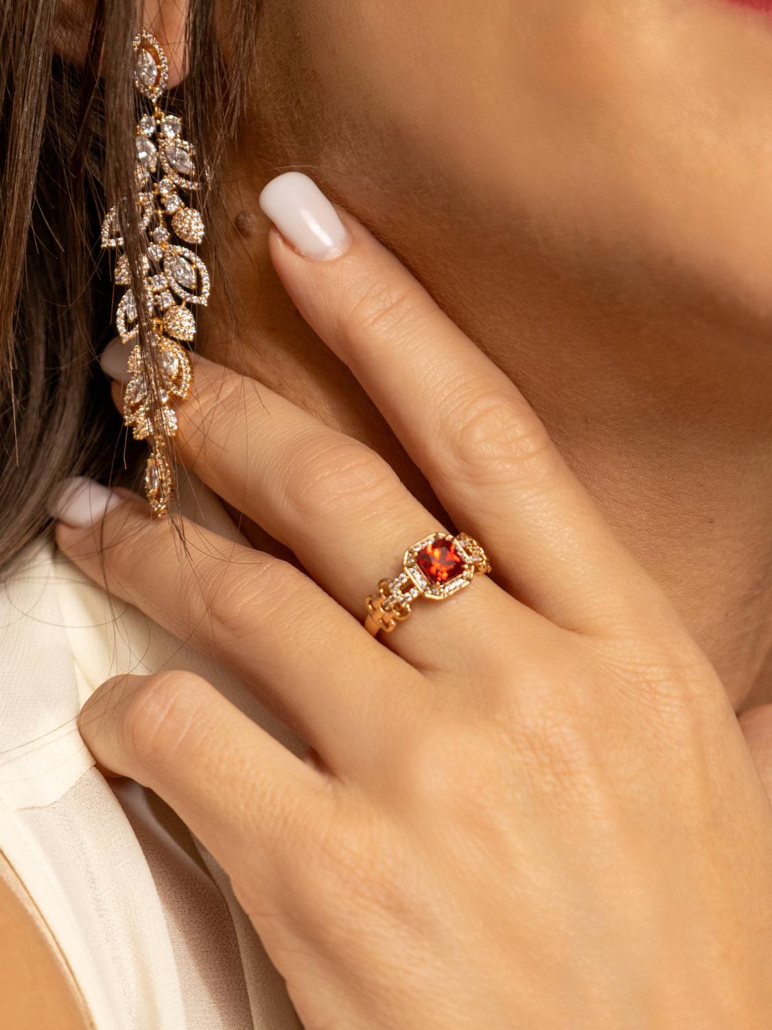 Το δαχτυλίδι 'Ruby Essence' αποτελεί μια εκφραστική δήλωση πολυτέλειας και πάθους. Στολισμένο με μια κεντρική κόκκινη πέτρα που συμβολίζει το πάθος και τη δύναμη, είναι πλαισιωμένο από λαμπερές πέτρες που προσθέτουν μια αύρα αίγλη. Το χρυσό στέλεχος είναι διακριτικά σχεδιασμένο για να ενισχύει τη λάμψη της κεντρικής πέτρας, καθιστώντας το δαχτυλίδι ιδανικό για κάθε εμφάνιση, από τις πιο κομψές μέχρι τις πιο καθημερινές.