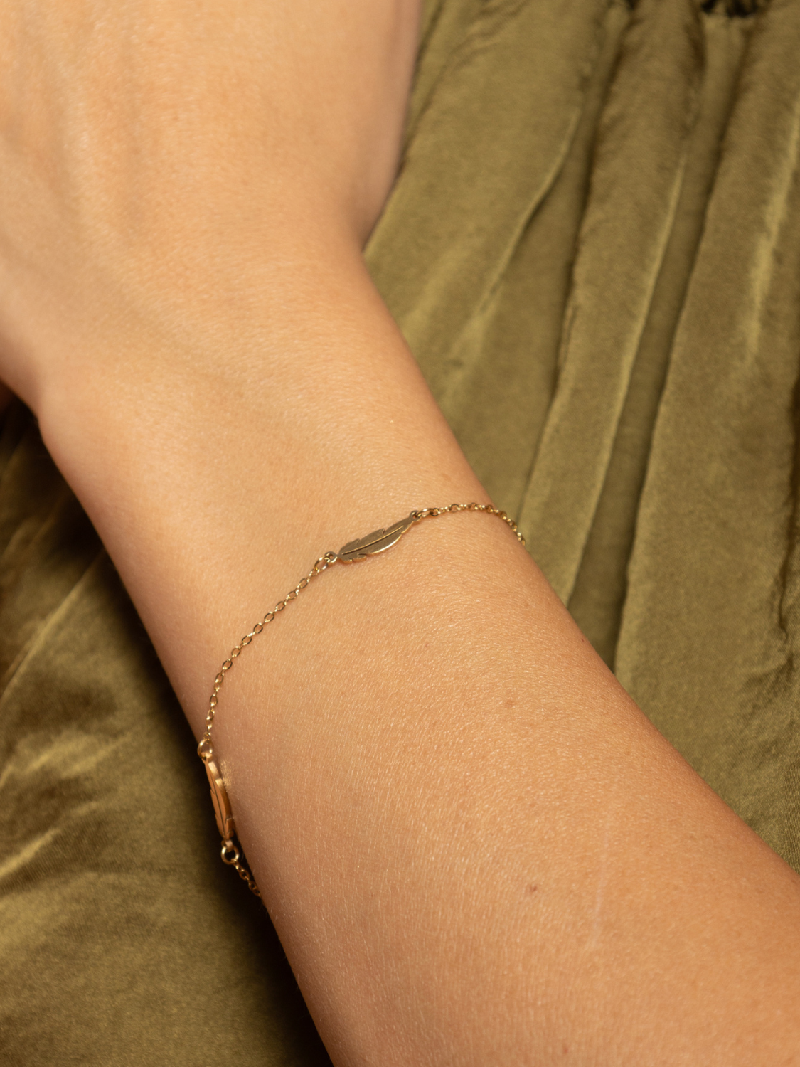 Το βραχιόλι 'Serenity Feather' είναι ένα εξαιρετικά λεπτό κόσμημα που απεικονίζει την ελευθερία και την αρμονία. Με το ανάλαφρο σχέδιο ενός φτερού που συμβολίζει την ελευθερία και την ψυχική ανύψωση, αυτό το χρυσό βραχιόλι αποτελεί ένα υπέροχο αξεσουάρ για κάθε μέρα. Είναι φτιαγμένο για να αντέχει στο χρόνο, καθώς είναι κατασκευασμένο από ανθεκτικό υλικό που δεν χάνει τη λάμψη του. Συνδυάστε το με τα αγαπημένα σας outfits και φέρτε μια αύρα ηρεμίας στην καθημερινή σας εμφάνιση.
