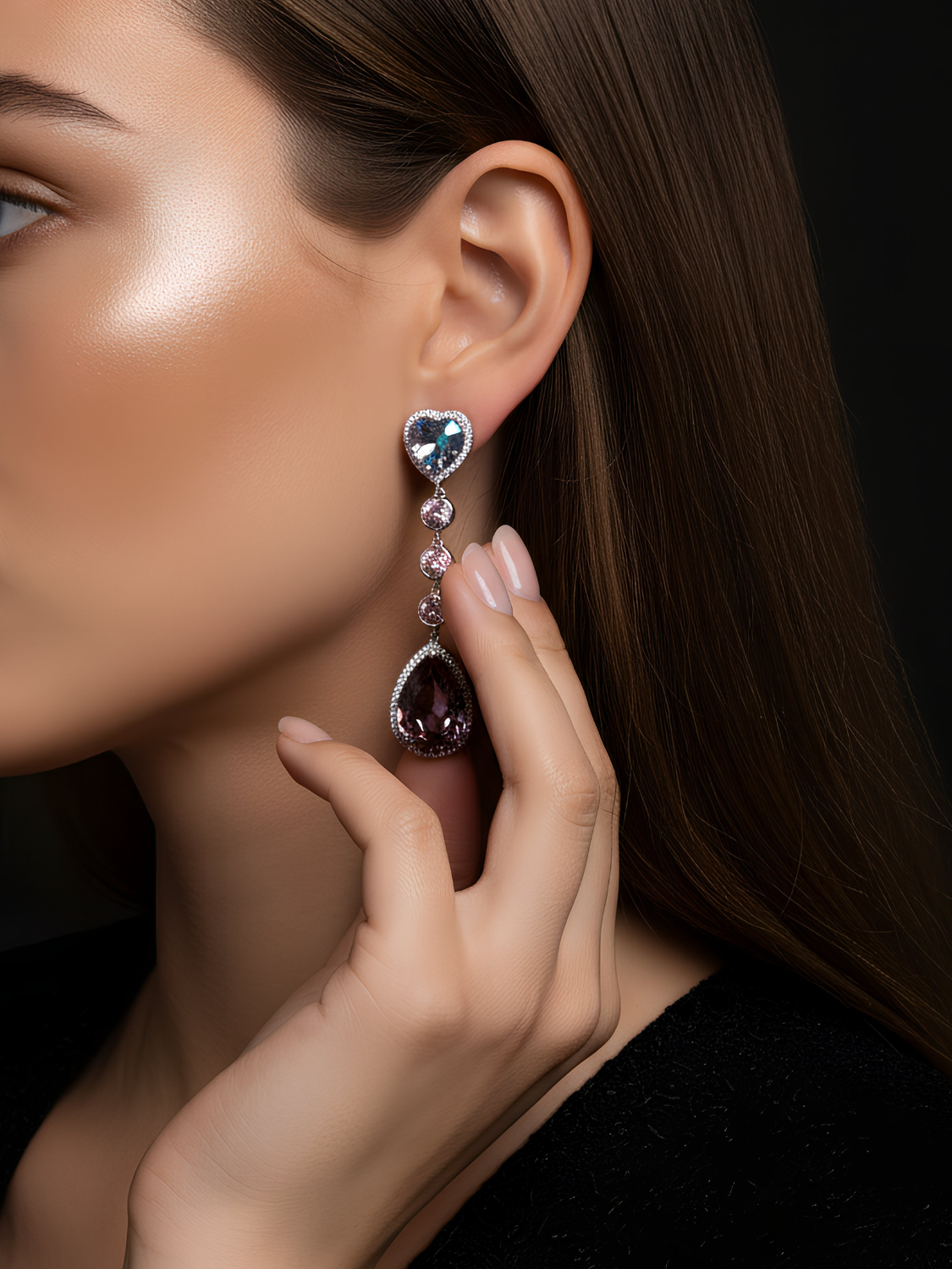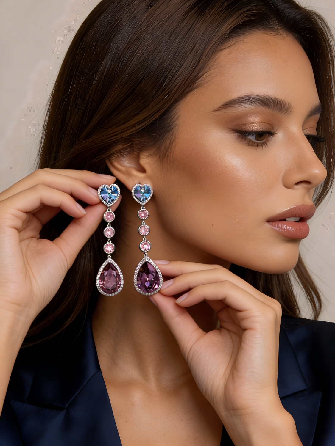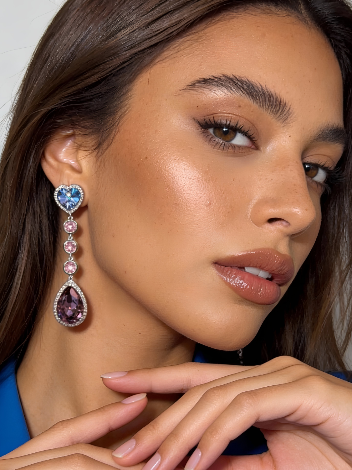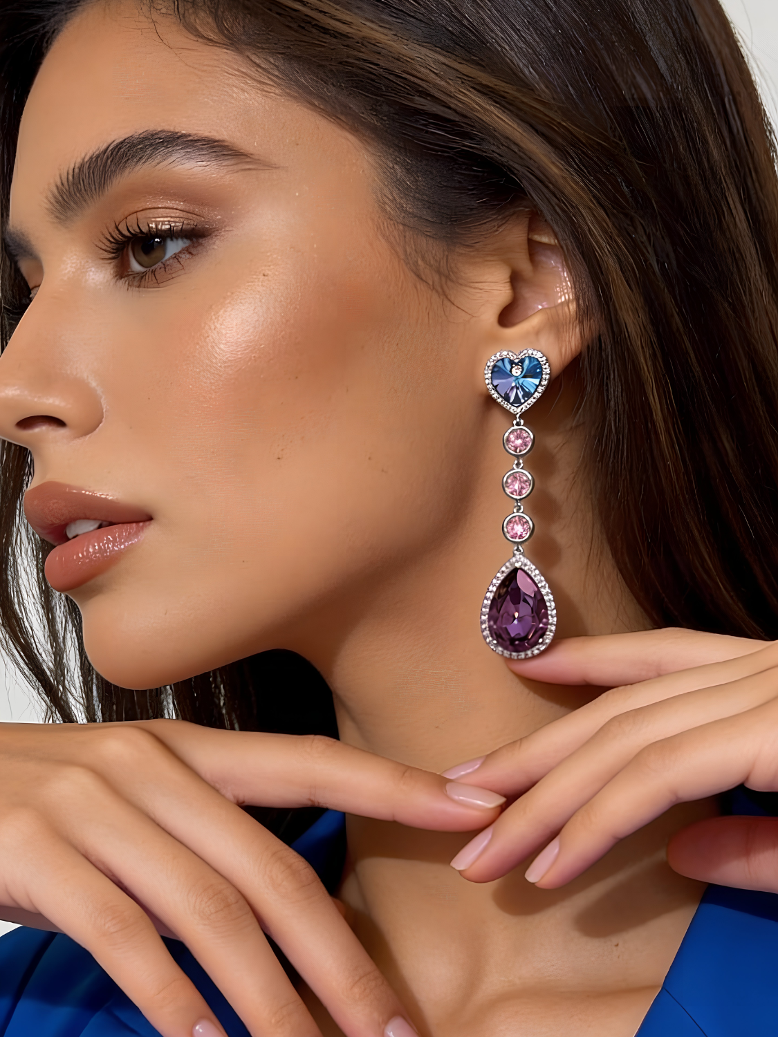 Αναδείξτε τη φινέτσα και τη θηλυκότητα σας με τα Aurora Blush Drops, εντυπωσιακά σκουλαρίκια με πολυτελή εμφάνιση. Στο επάνω μέρος ξεχωρίζει μια λαμπερή κρυστάλλινη καρδιά σε τόνους του μπλε και λιλά, ενώ καταλήγουν σε μια μεγαλοπρεπή σταγόνα από μοβ κρύσταλλο, πλαισιωμένη από ροζ στρας. Ένα εκλεπτυσμένο και ρομαντικό σχέδιο που μαγνητίζει τα βλέμματα.