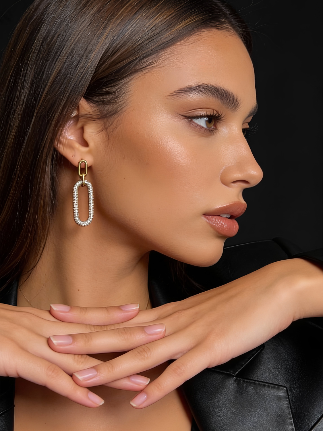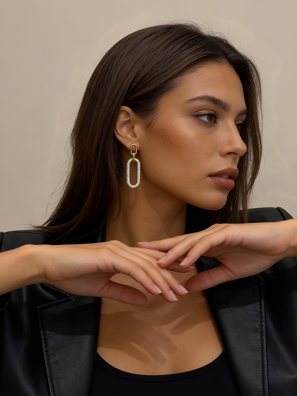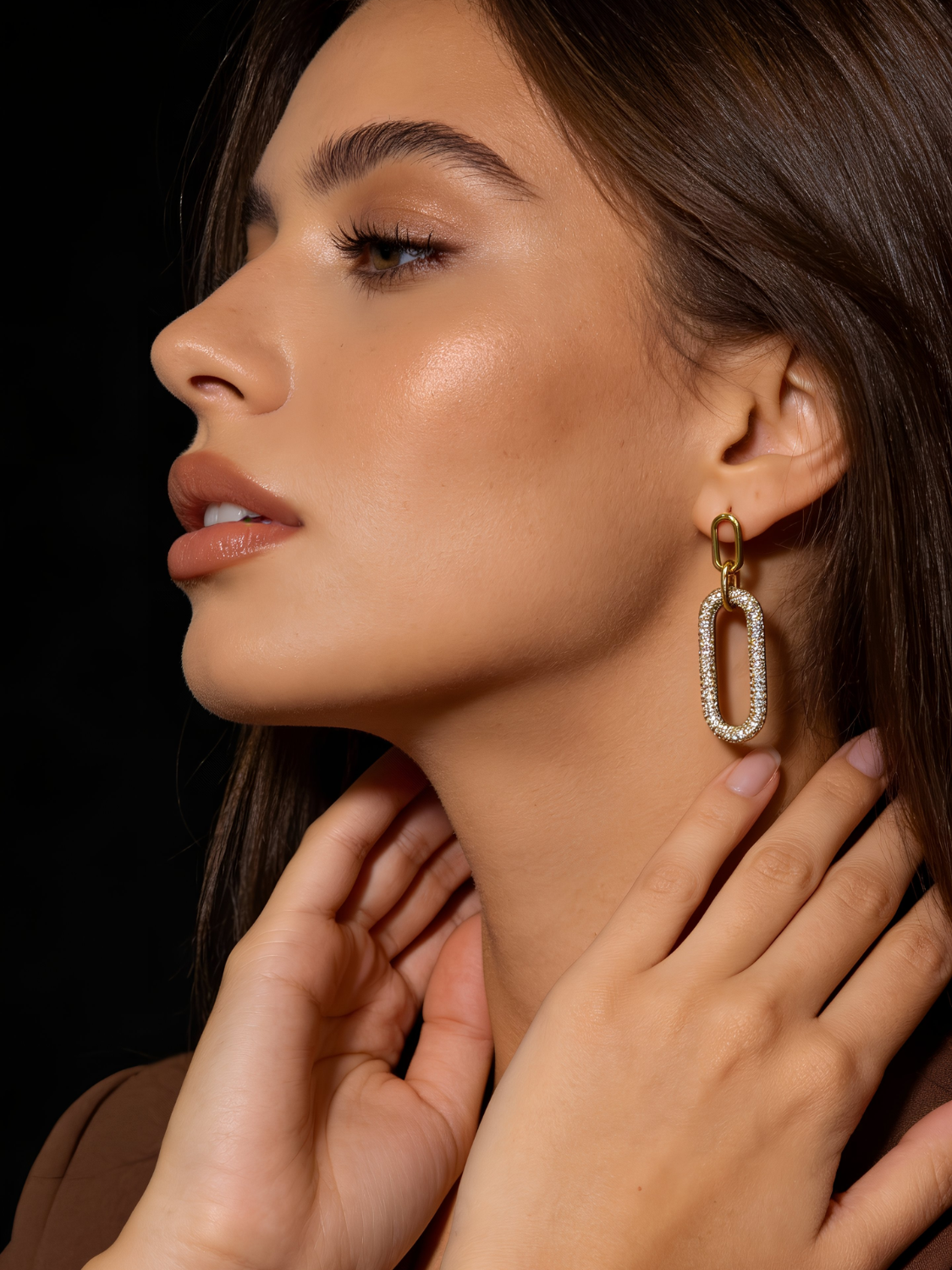 Τα Σκουλαρίκια Oval Link είναι ο ιδανικός συνδυασμός κομψότητας και μοντέρνου σχεδιασμού. Κατασκευασμένα από οικολογικό χαλκό με επίστρωση 14Κ χρυσού, αυτά τα σκουλαρίκια αποπνέουν πολυτέλεια και διαχρονικότητα. Ο ιδιαίτερος σχεδιασμός τους με το οβάλ σχήμα, πλαισιώνεται από λαμπερά συνθετικά ζιρκόν που προσδίδουν μία λαμπερή εμφάνιση σε κάθε σας εμφάνιση. Το ελαφρύ τους βάρος τα καθιστά ιδανικά για καθημερινή χρήση, ενώ η εκλεπτυσμένη αισθητική τους τα καθιστά κατάλληλα για ειδικές περιστάσεις.