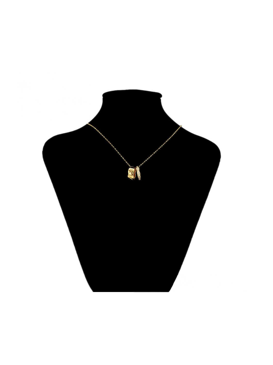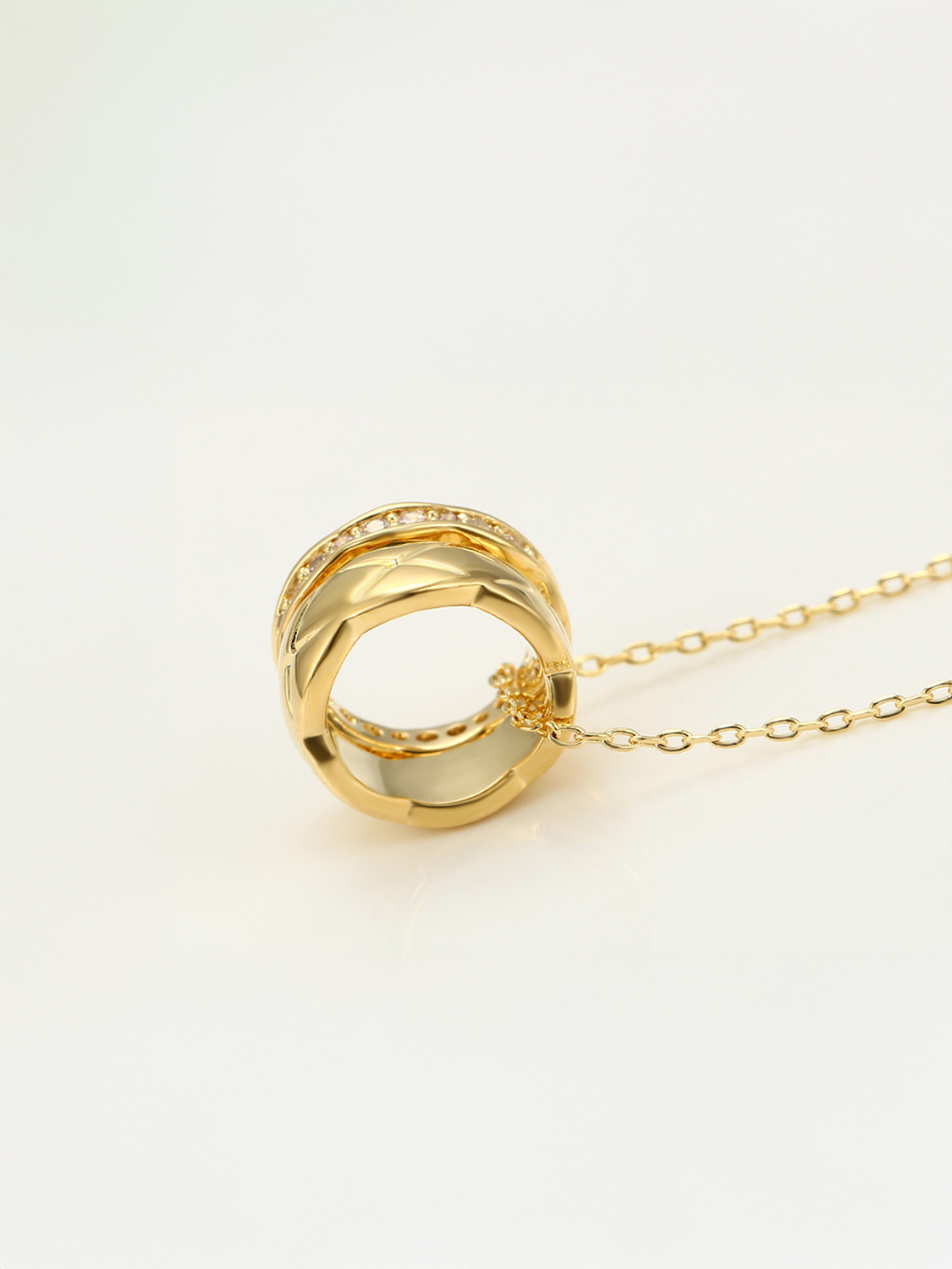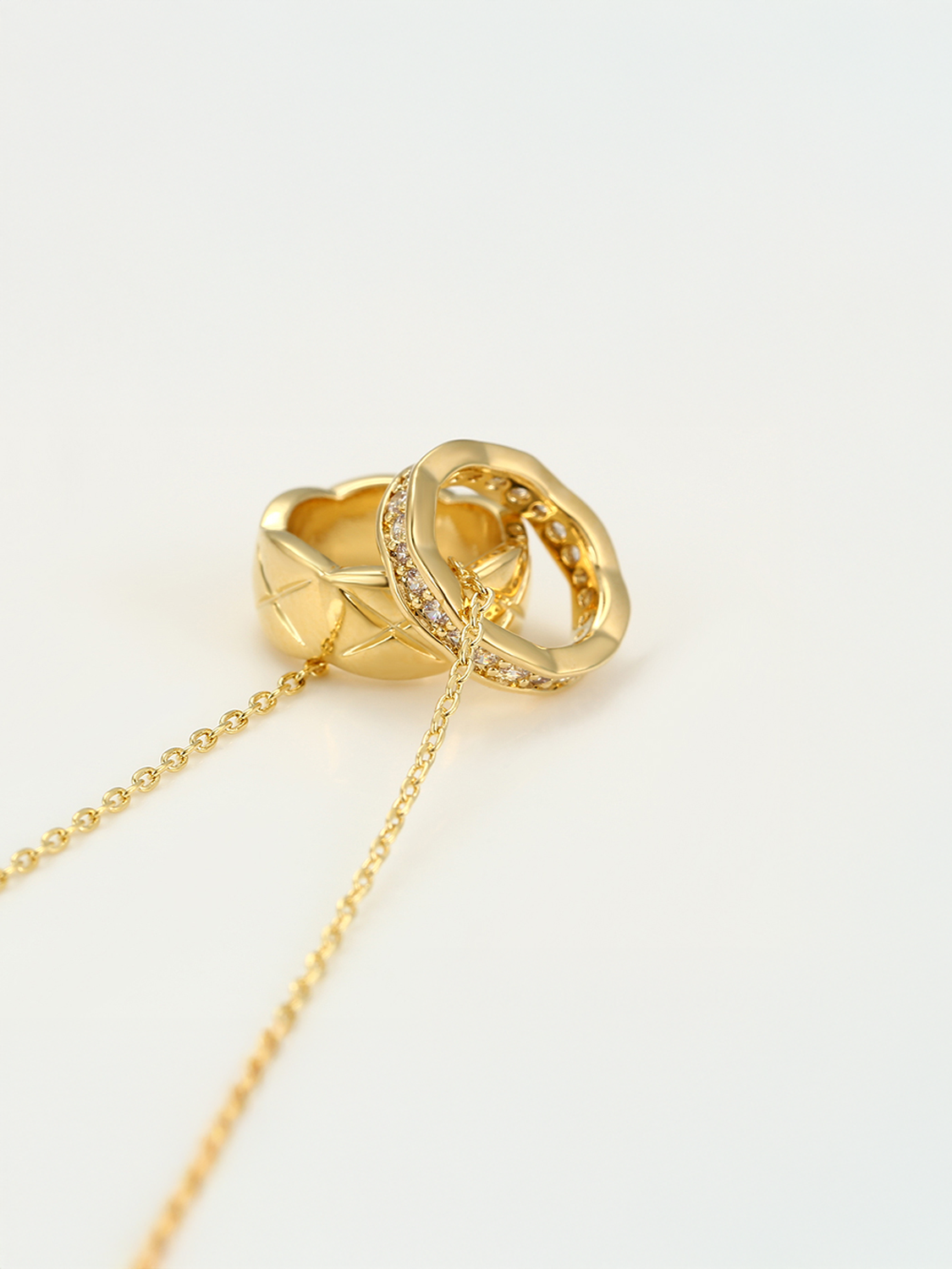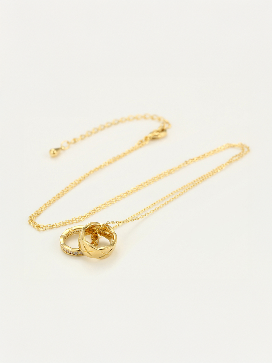 Ένα εκλεπτυσμένο κολιέ που συνδυάζει την κομψότητα και την πολυτέλεια. Το Golden Harmony παρουσιάζει δύο κρεμαστά δαχτυλίδια: το ένα με λαμπερές πέτρες ζιργκόν που αντανακλούν το φως σε κάθε κίνηση, και το άλλο με μοντέρνο ανάγλυφο σχέδιο. Ιδανικό για να συνοδεύσει το καθημερινό σας στυλ ή να χαρίσει μια διακριτική πολυτέλεια στις βραδινές εμφανίσεις σας. Ένα κόσμημα που συμβολίζει την ενότητα και την αρμονία.