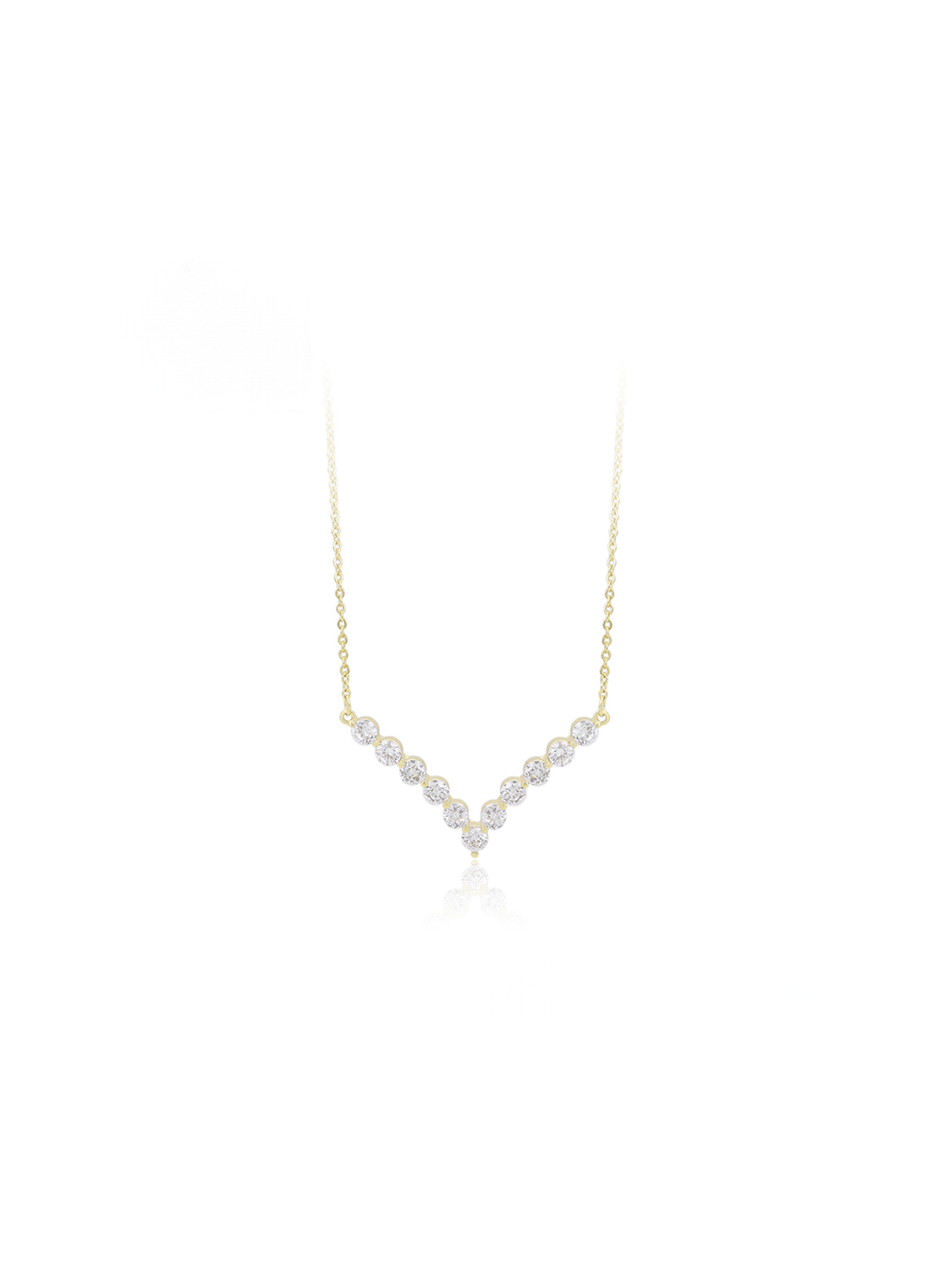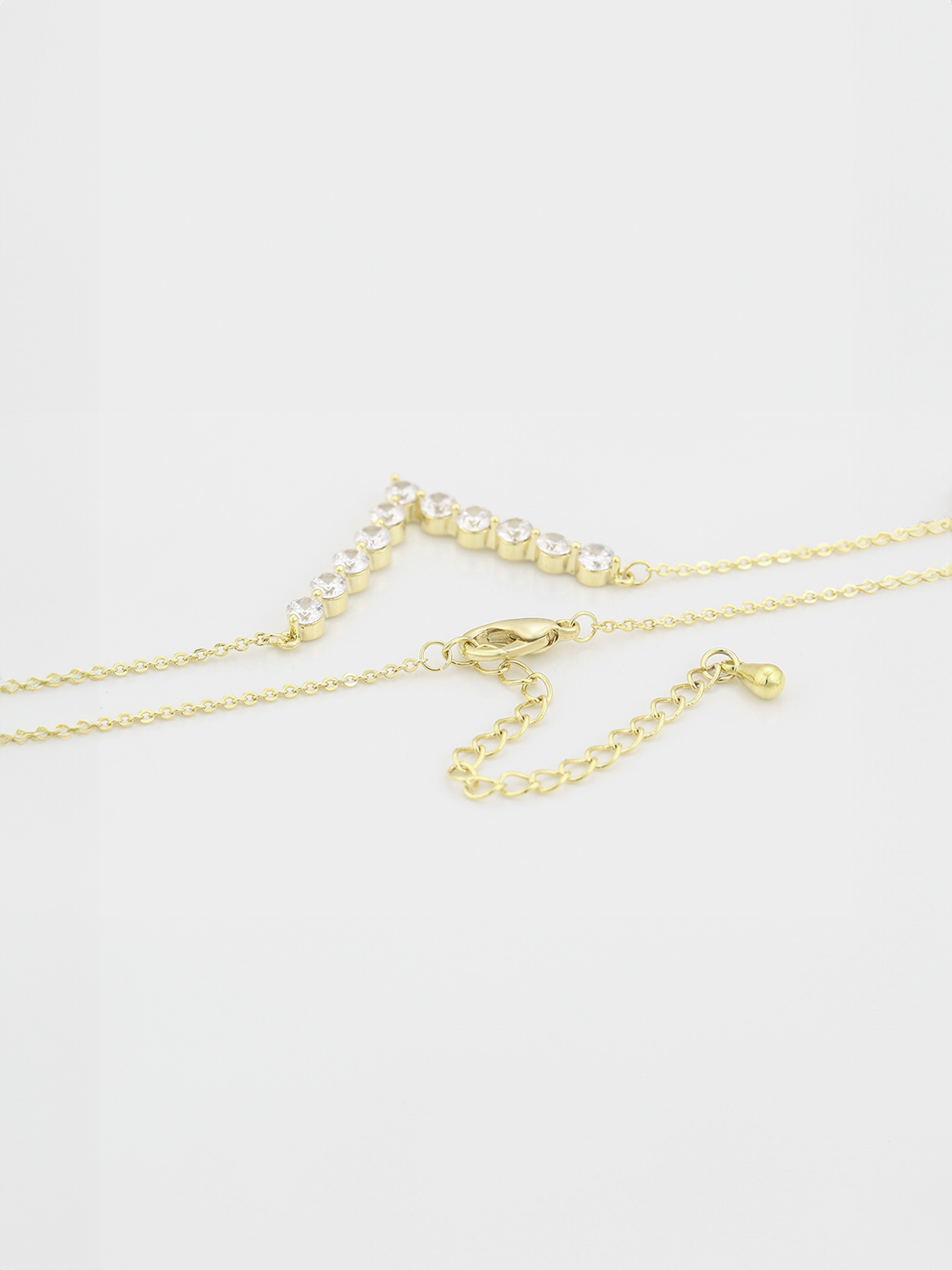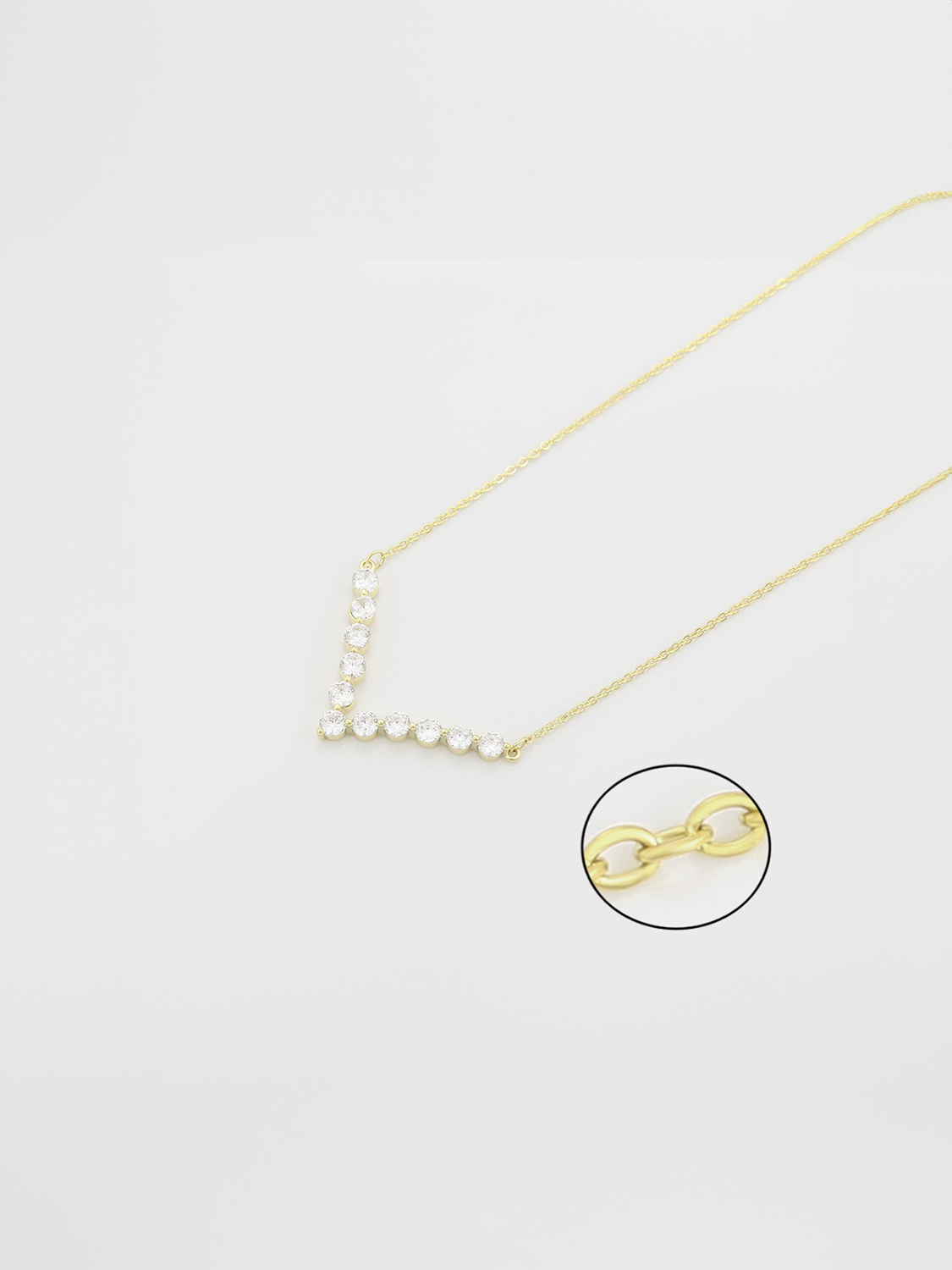 Αναδείξτε την κομψότητα και τη λάμψη σας με το κολιέ "Radiant Vibe". Το κολιέ διαθέτει εντυπωσιακές συνθετικές πέτρες ζιργκόν (CZ) σε λαμπερό χρώμα, δημιουργώντας ένα διακριτικό και πολυτελές αποτέλεσμα. Το σχήμα "V" του κολιέ προσδίδει μοναδικότητα και φινέτσα, ιδανικό για να προσθέσει μια πινελιά κομψότητας σε κάθε σας εμφάνιση.