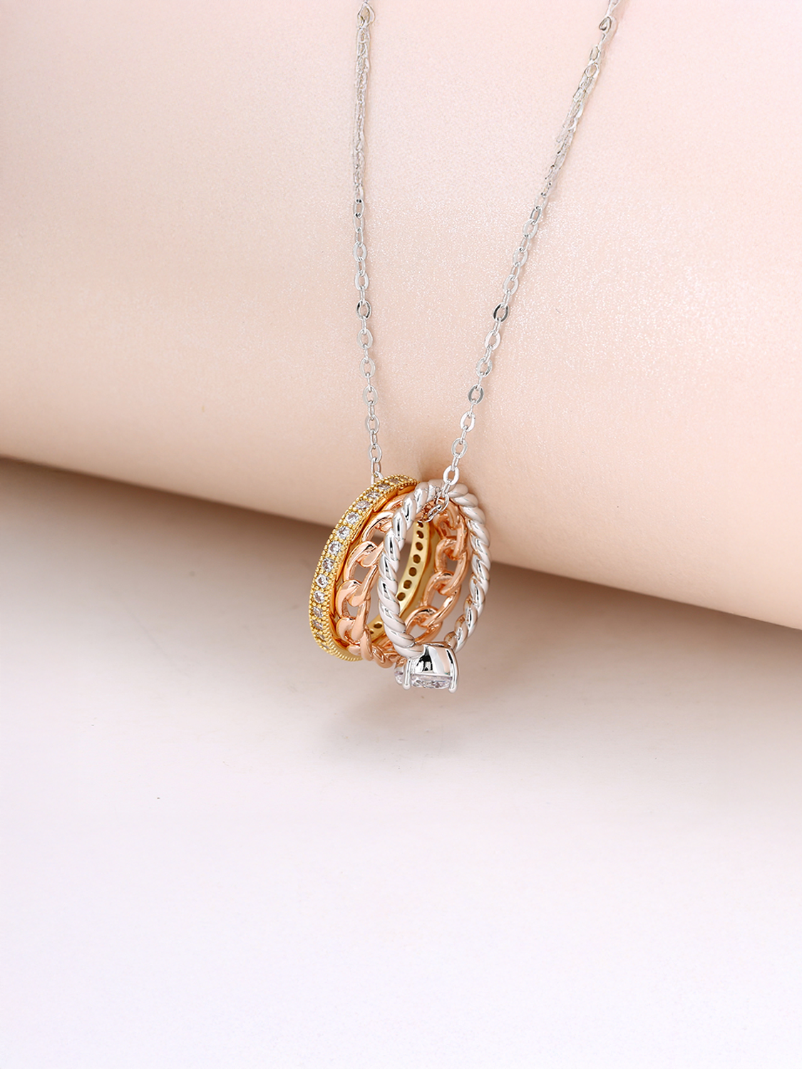 Ένα εντυπωσιακό κολιέ που συνδυάζει τρεις κρίκους σε αποχρώσεις ασημί, ροζ χρυσό και χρυσό, διακοσμημένους με λαμπερά ζιργκόν. Το Κολιέ Trinity Harmony είναι ένα κόσμημα που αποπνέει κομψότητα και συμβολίζει την ενότητα, την αγάπη και την ισορροπία. Ιδανικό για να αναβαθμίσει κάθε σας εμφάνιση – από καθημερινές στιγμές μέχρι ξεχωριστές περιστάσεις.