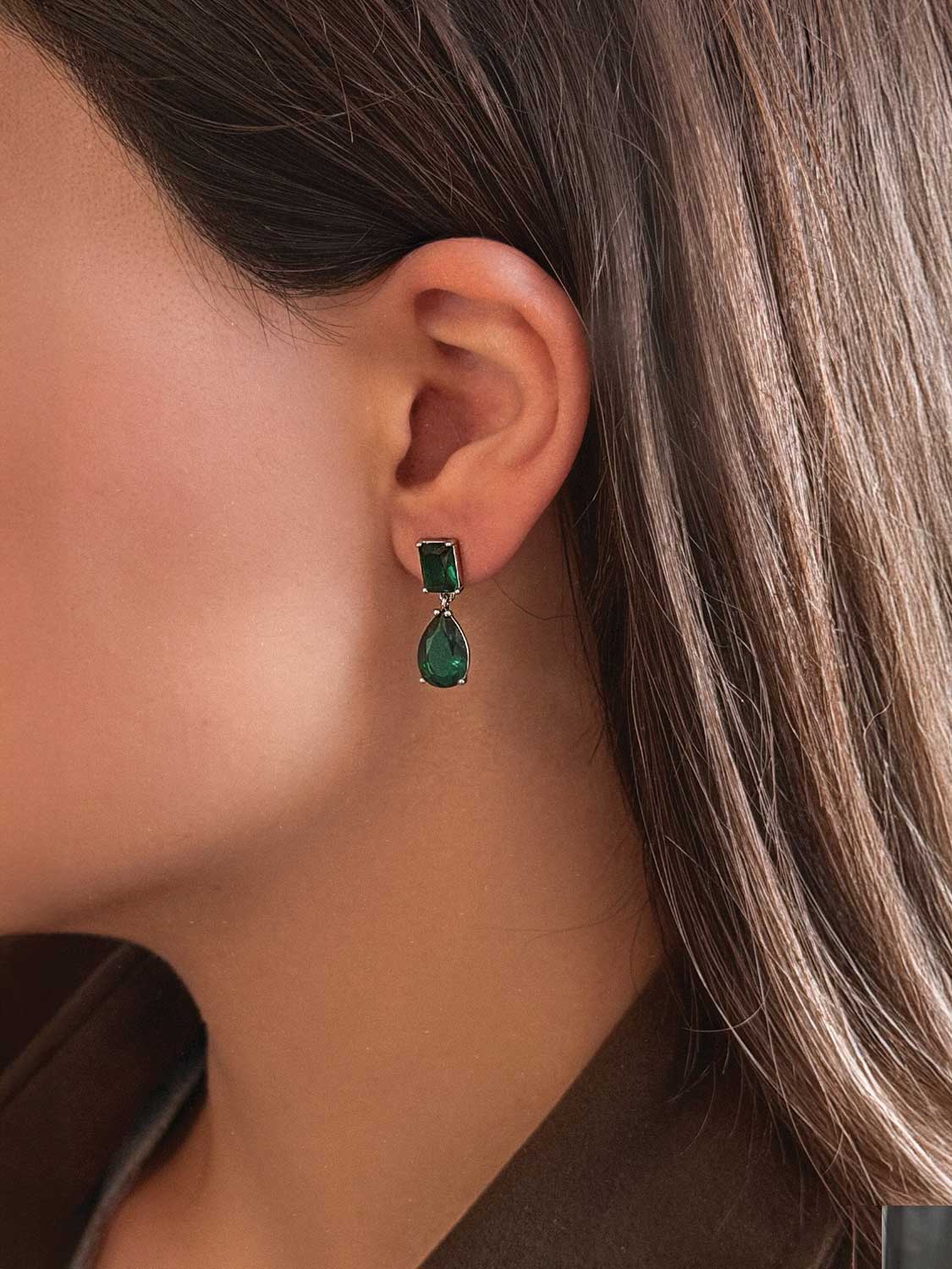 Women's Glitter Drop Earrings Platinum Plated with Green Crystal